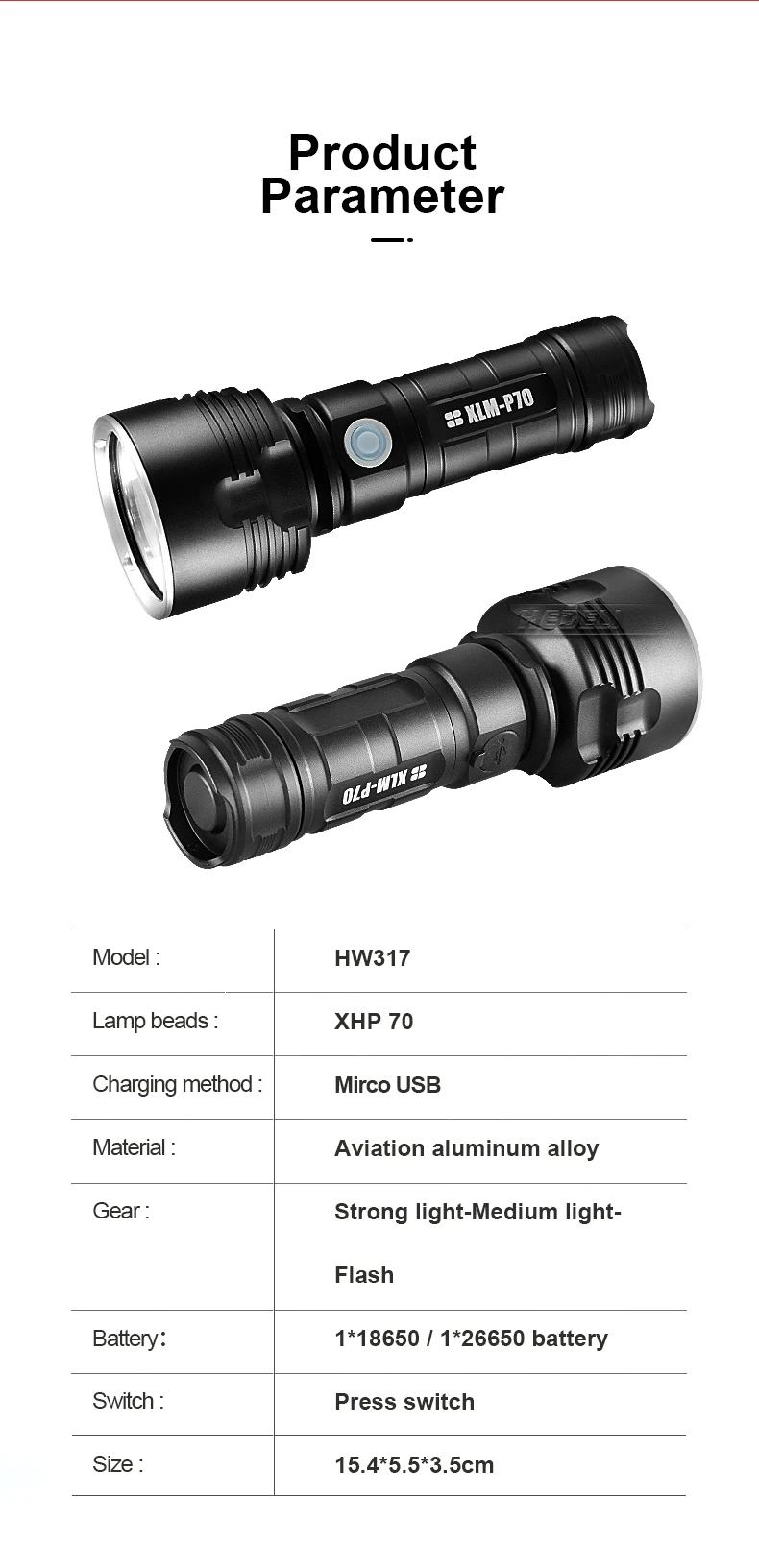 Особенности продукта:Бренд: HEDELIНазвание продукта: HW510Светодиодный: T6Режим: 5 режимов сильный-средний-низкий-стробоскоп-SOSДиапазон: 200-450 метровЦвет света: белый светильникТип батареи: 1*18650 или 1*26650Время освещения: 2,5-5 часов