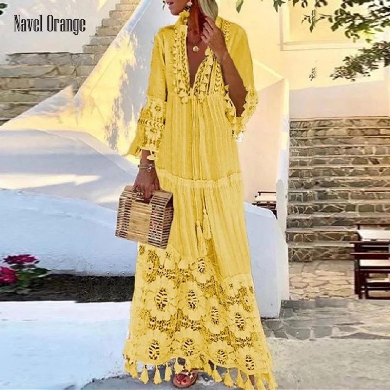 Платье женское длиной до пола с глубоким V-образным вырезом, ажурное повседневное винтажное лоскутное, в богемном стиле, с завязкой и кисточками, в стиле пэчворк, на лето