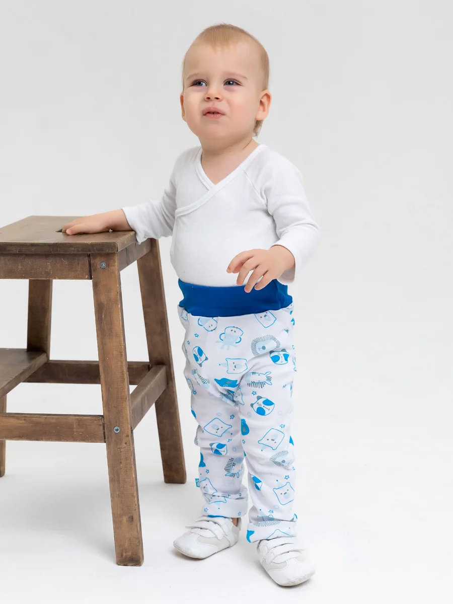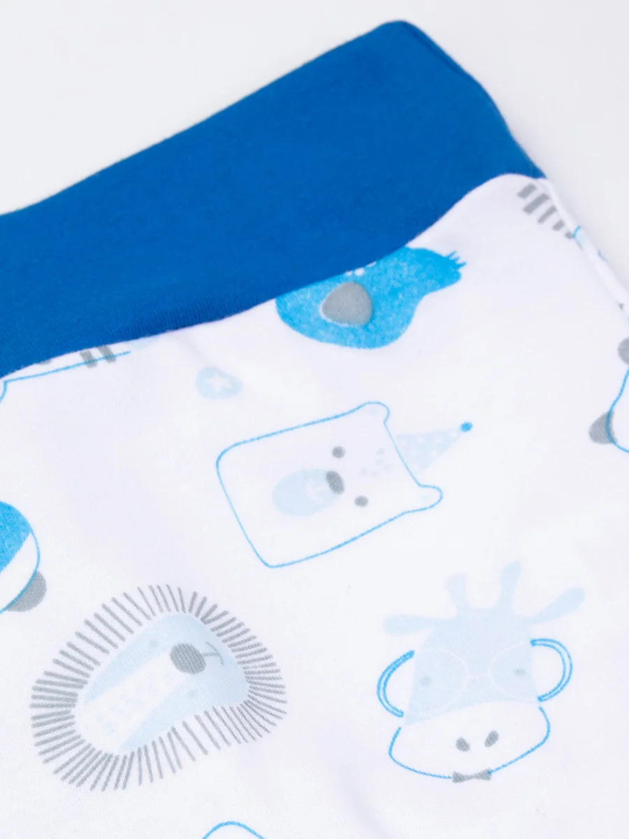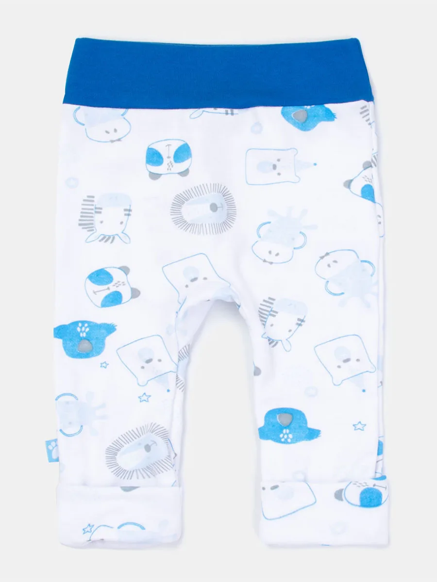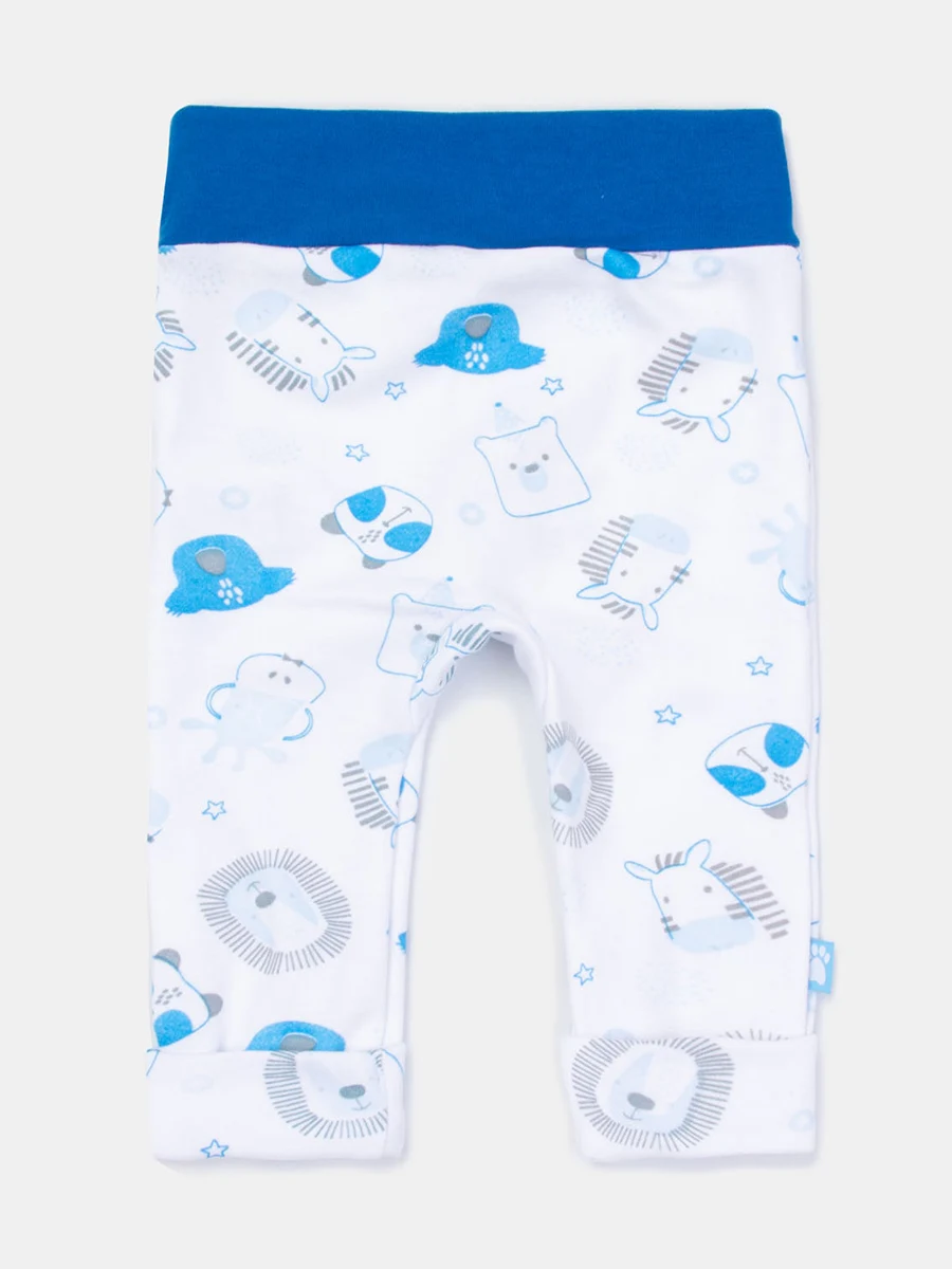 Белые штанишки с животными для новорождённого из коллекции «Wild Animal». Отлично подойдут для ежедневных активных игр, самого сладкого сна или в качестве приятного подарка. Модель изготовлена из натурального 100% хлопка (интерлок). Главные фишки – контрастные синие манжеты, набивка с забавными животными и продуманный до мелочей крой. Широкая резинка не даст штанам сползти и подарит ощущение легкости. Модель будет идеально сочетаться с боди, джемпером и толстовкой из одноимённой коллекции.