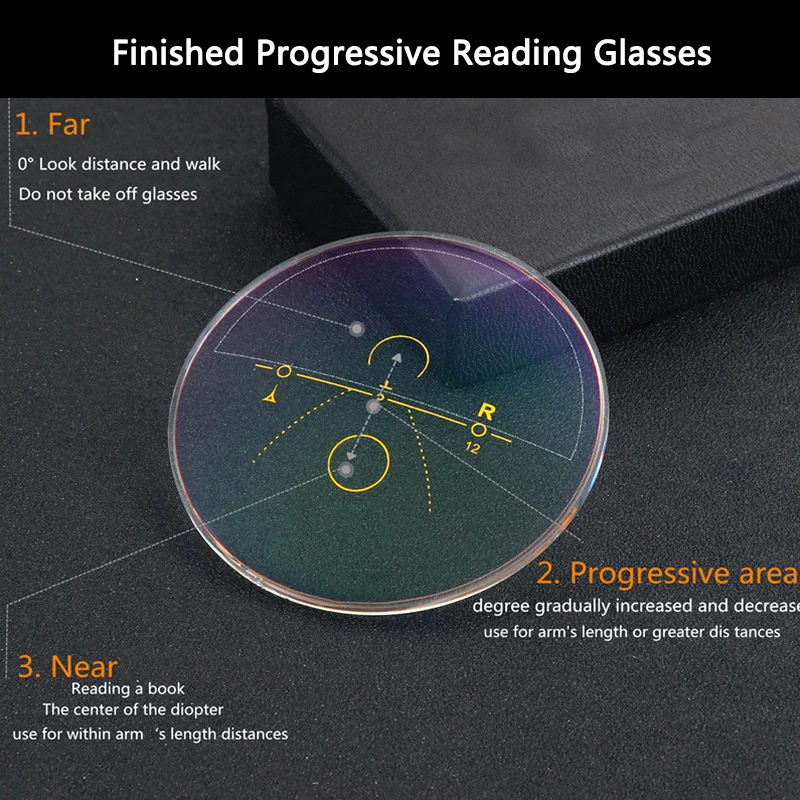 Линзы этих очков-Готовые прогрессивные Мультифокальные линзы. Степень, которую вы покупаете, это степень в нижней части линзы (посмотрите ближе) и степень в верхней части (посмотрите далеко)-0. Значение PD (расстояние между зрачком) 62 ± 2 мм.