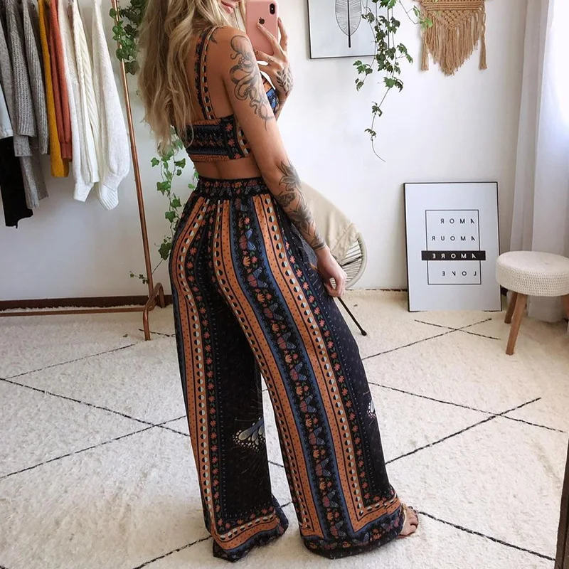Из 2 предметов, костюм Летний тренировочный костюм Комплекты Женские костюмы в стиле Бохо пляжные Стиль принт нижнее бельё для девочек, свободные, широкие в ноге, штаны Ropa новый дропшиппинг