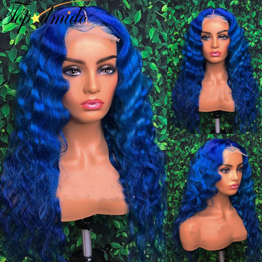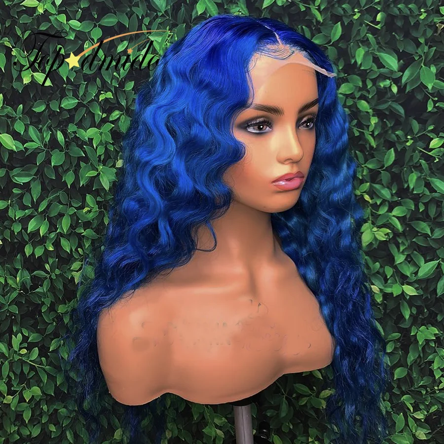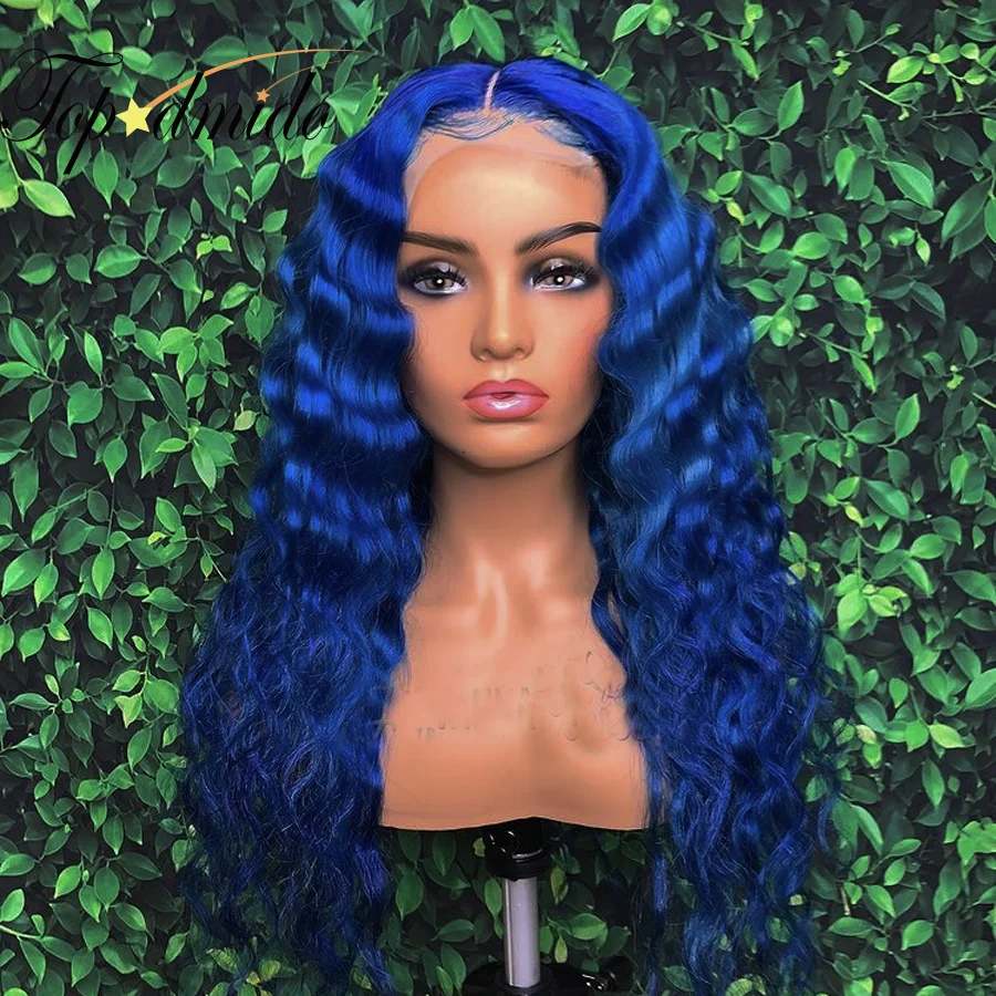 Topodmido синий цвет 13x 4 кружевные передние искусственные 13X6 индийские человеческие волосы кружевные парики для женщин бесклеевые парики с глубокой волной