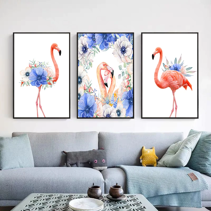 Постеры с изображением розовых фламинго и синих цветов и Настенная картина принты картины на холсте для украшения гостиной, детской комнаты