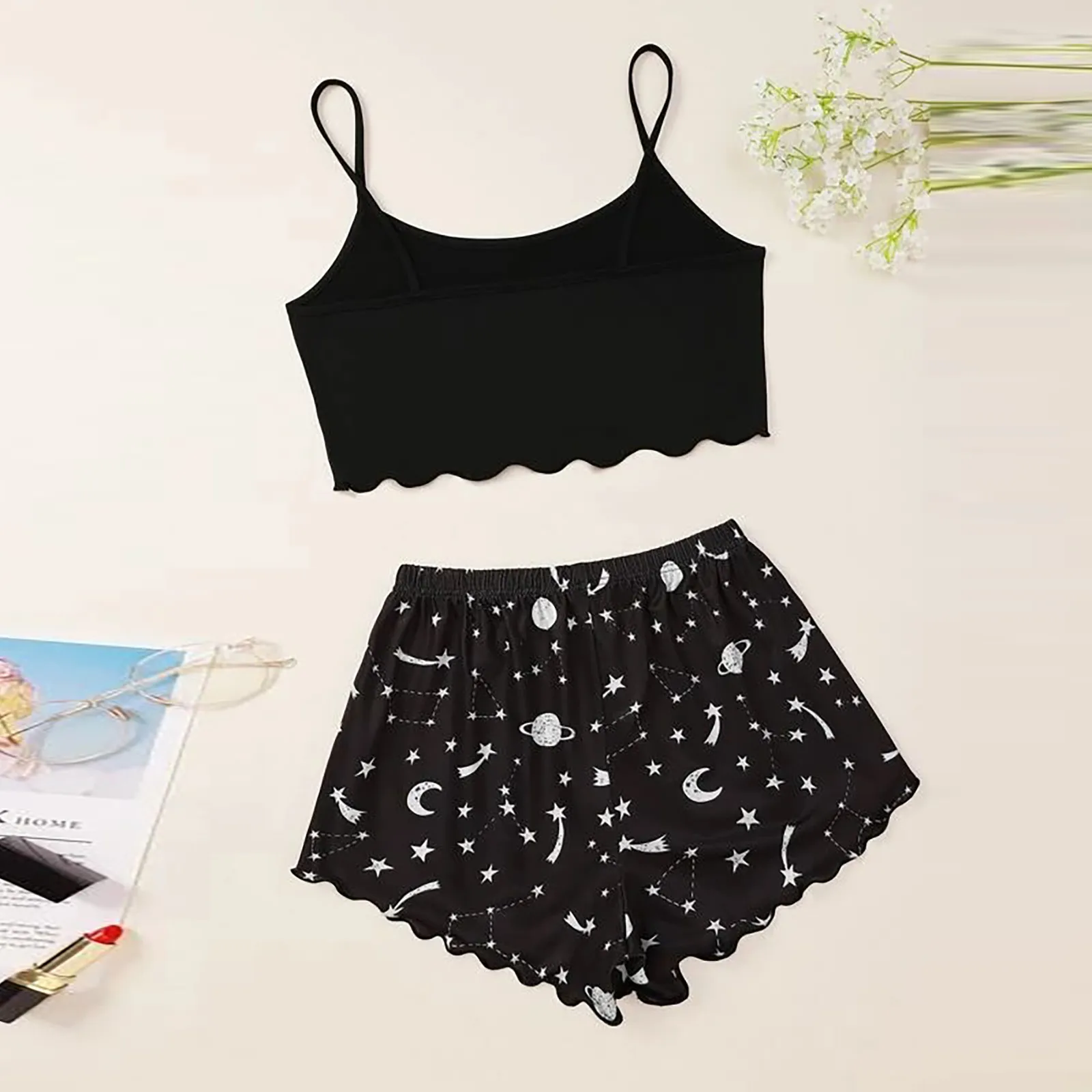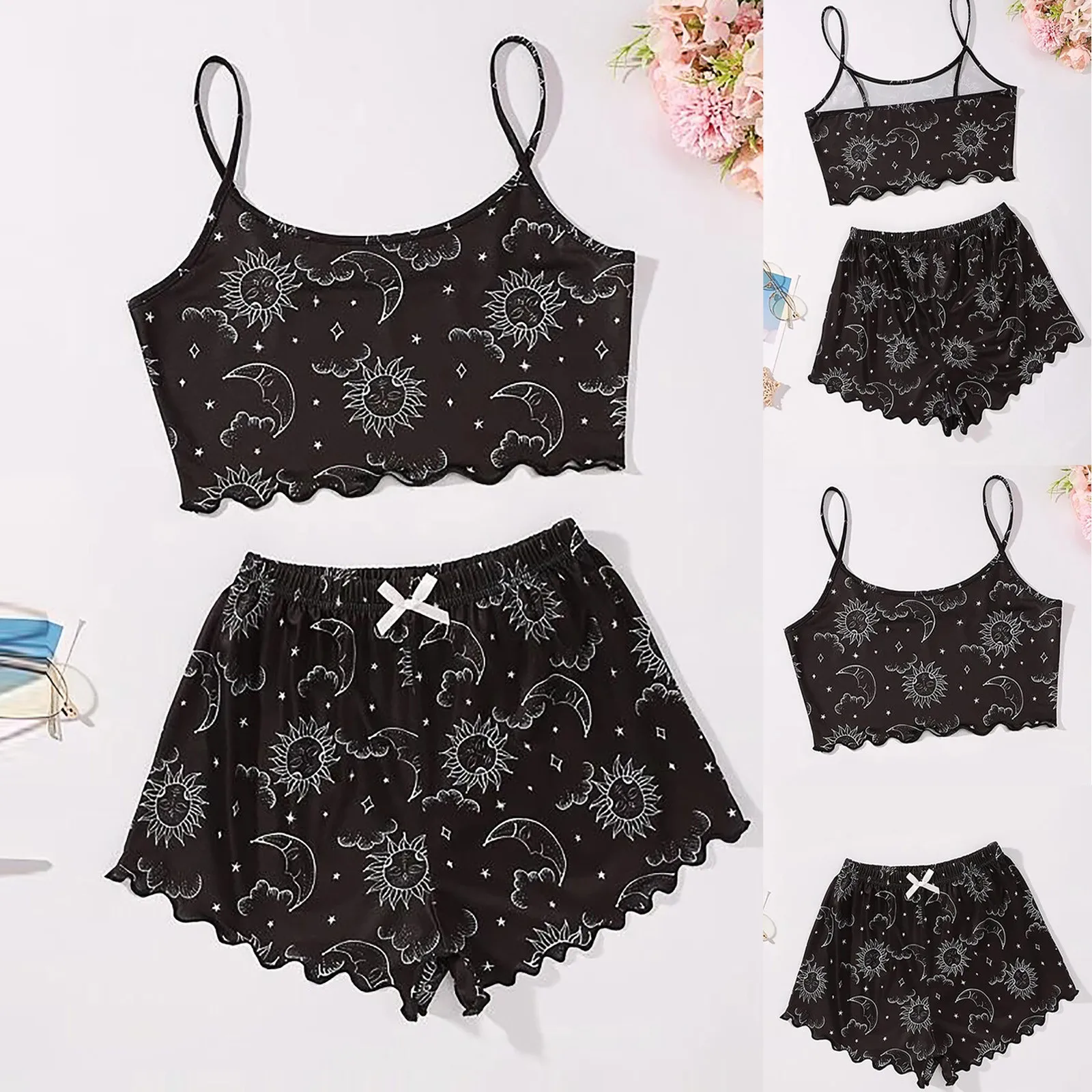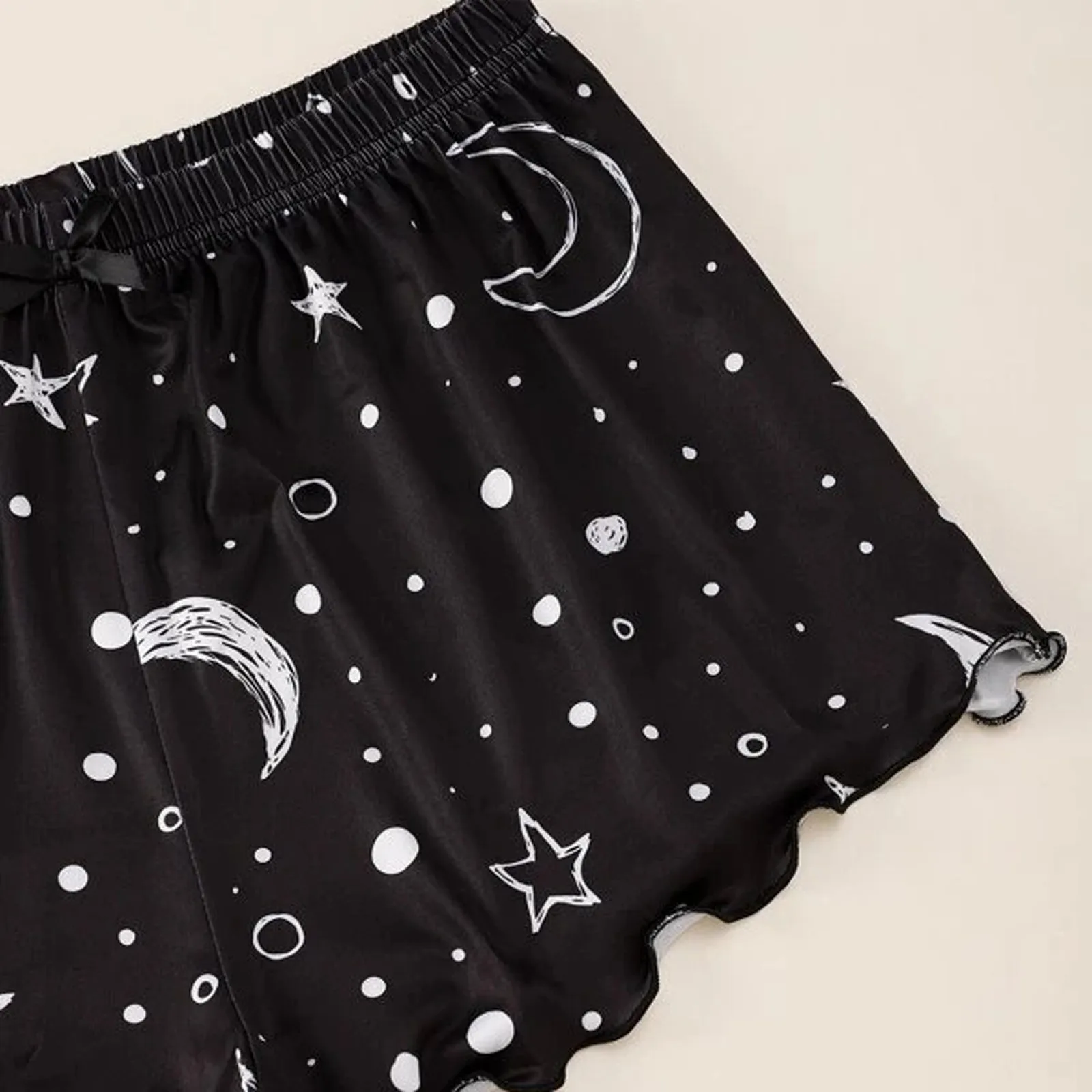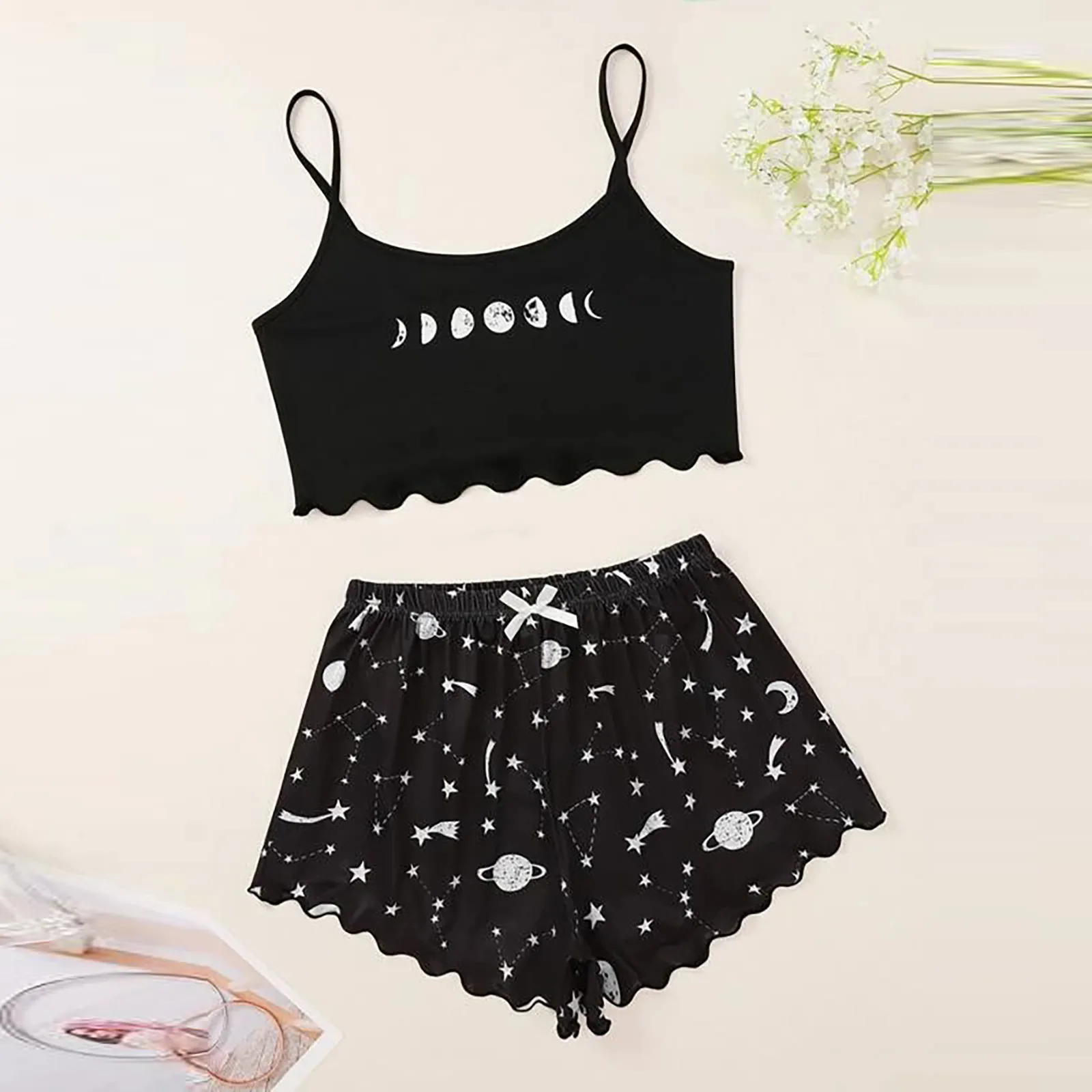 Пижамные комплекты с принтом звезд и луны, с бантом и квадратным воротником, черная одежда для сна для женщин, новинка 2021, модная ночная одежда, женская одежда