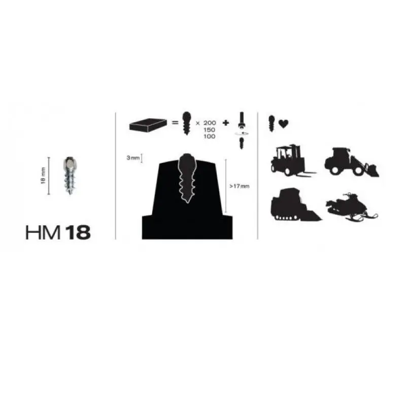 Модель HM-18 подходит для минитрактора, вилочного погрузчика, снегоуборочной техники, с/х техники, фронтального погрузчика.Шипы противоскольжения MaxiGrip - запатентованные вкручиваемые шведские шипы, предназначенные для самостоятельной установки.