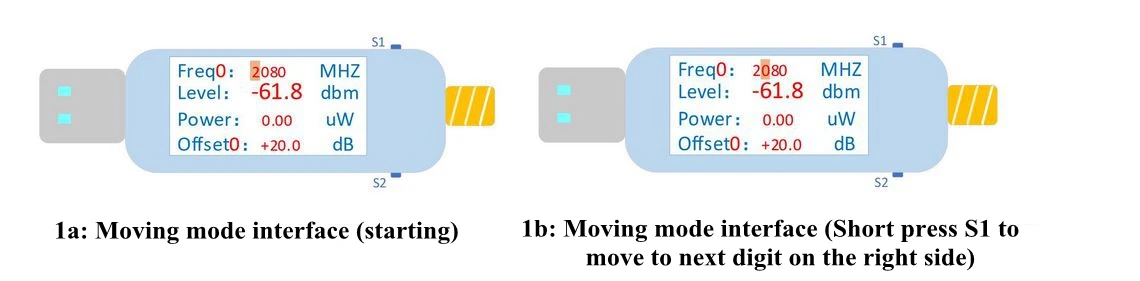 С учетом того, что может потребоваться измерениеСигналы с большей мощностью и линейностью обнаруженияУстройства, Фиксированный аттенюатор обычно добавляется перед сигналомВходной терминал и Offset0-это значение коррекции мощностиКомпенсировать затухание сигналаАттенюатор.Например, при добавлении аттенюатора a -20dBm на вход,Вам нужно установить Offset0 до + 20dBm. В это время,Отображаемое значение мощности-это значение мощности входного сигналаПлюс 20dBm для отображения значения мощности оригинального сигналаДля компенсации воздействия аттенюатора.(3) Режим перемещения курсора:При запуске установки частоты тестирования нажмите и удерживайте S1 дляЧерез две секунды, после освобождения, он войдет в режим движения.Как показано на рисунке, курсор остается на самом высоком уровнеПоложение значения в строке Frequ. Короткий пресс S1И S2 для перемещения курсора влево и вправо.