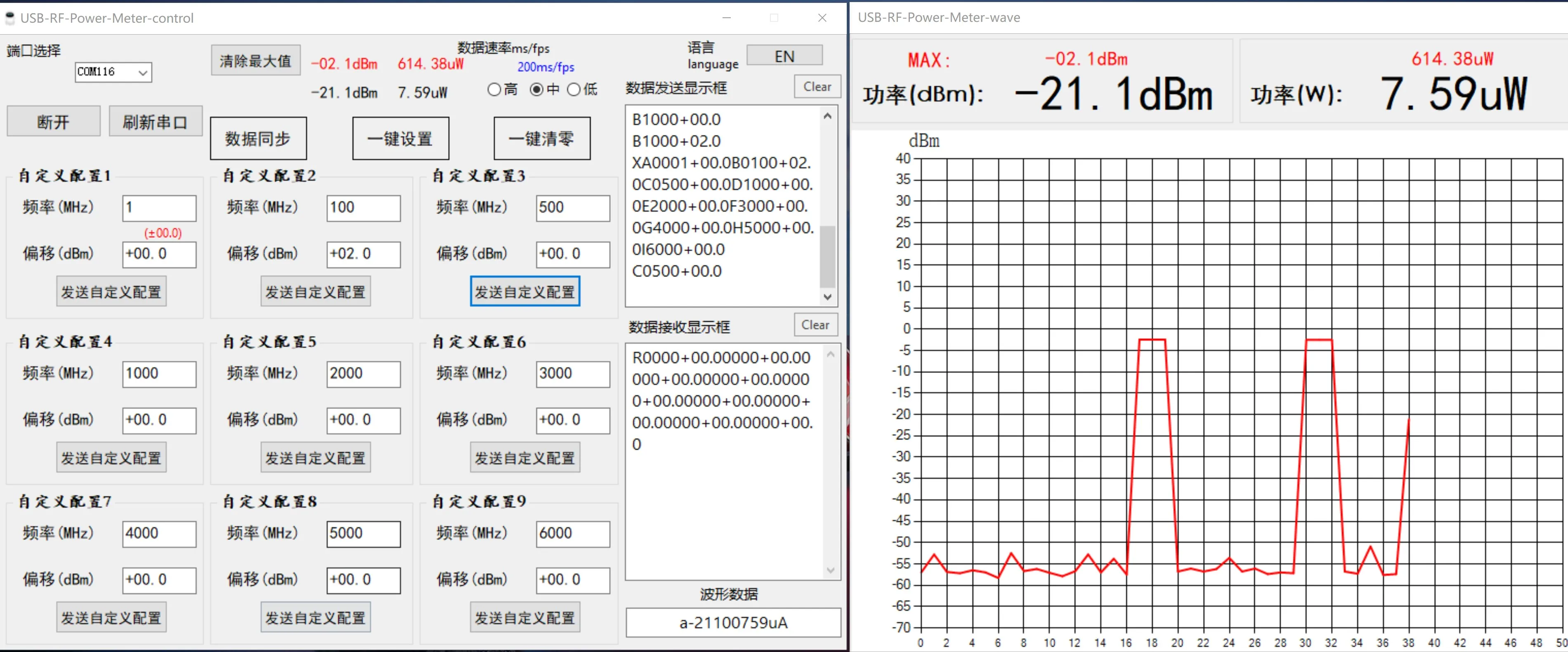 Общее чувство радиочастоты:ДБ является чистым счетным блоком:Для мощности, дБ = 10 * lg(A/B).Для напряжения или тока, дБ = 20 * lg(A/B).DBm определяет miliwatt. 0 дБм = 1 мВт;DBw определяет ватт. 0 dBw = 10lg1 w = 10lg1000 mw = 30 dBm.По умолчанию dB всегда определяет блок питания, которыйРассчитано как 10lg. Конечно, в некоторых случаях сигналПрочность (амплитуда) может использоваться для описания работы и мощности.В этот чехол, используйте 20lg как измерительный прибор. Это относится к обоимПоле управления и поле обработки сигнала. ДляНапример, иногда вы можете увидеть выражение dBmV.Управление интерфейсом:1. Описание дисплея интерфейса:-FreqX: частота, которую нужно проверить, по умолчанию Freq0,И 8 групп часто используемых частотных точек(Freq1-Freq8) может храниться, который может быть установлен нажатиемКлюч или поддержка верхнего компьютера.-Уровень: значение мощности в дБм соответствует токуЧастотная точка.-Мощность: точка частоты тока СоответствуетМощность в uW или mW в качестве блока.-OffetX: значение коррекции мощности, по умолчанию Offet0, и8 наборов коррекционных значений, соответствующих частотеТочки (Offet1- Offet8) могут храниться, которые могут быть установленыНажатие кнопки или поддержка верхнего компьютера.2. Краткое описание работы интерфейса:Есть две кнопки на измерителе мощности, которые определяютсяКак: перед измерителем мощности, верхняя кнопка S1 иНижняя кнопка S2. Два в основном предназначены для тестирования частотыНастройка и настройка значения коррекции мощности.В тестовом состоянии, короткое нажатие кнопки S1 и S2 для переключенияМежду частыми точками и соответствующей мощностьюЗначения коррекции.Удерживайте кнопку S1 в течение одной секунды, отпустите ее, чтобы войтиИнтерфейс мобильной регулировки. В это время интерфейсДанные остановят обнаружение, и курсор остается наПоложение, в котором он перемещался в прошлый раз, и по умолчаниюПоложение с самой высокой частотой. В это время, короткоеНажмите S1, чтобы переместить курсор вправо и нажмите клавишу S2Для перемещения курсора влево. При перемещении в положениеЧто нужно отрегулировать, нажмите и удерживайте S2, чтобы войтиРежим регулировки. В это время, номер, который нужно отрегулироватьОтображается в желтом цвете. Короткое нажатие S1 для увеличения, короткое нажатиеS2 для уменьшения. После настройки определенной цифры нажмите иУдерживайте S2, чтобы выйти из режима регулировки и вернуться к движениюРежим. Затем повторите вышеуказанные шаги для регулировки других чисел.После окончания цифровой регулировки нажмите и удерживайте S1 доВыйдите из настройки мобильного телефона и введите режим измерения. ДанныеОбычно обновляется.В обычном режиме, короткое нажатие S1 и отпустите его, чтобы выбратьИзмерение часто используемых диапазонов частот. Короткий пресс S2Чтобы выбрать предыдущий часто используемый частотный диапазон.3. Подробные инструкции по интерфейсу:Измеритель мощности имеет четыре режима работы: нормальное измерениеРежим, быстрый режим переключения, режим перемещения курсора и числовойРежим регулировки.(1) Нормальный режим измерения:В обычном режиме измерения измеритель мощности отображаетМощность в dBm и uW или mW, соответствующая токуЧастотная точка, как показано в обычном режиме измерения вНа картинке ниже.