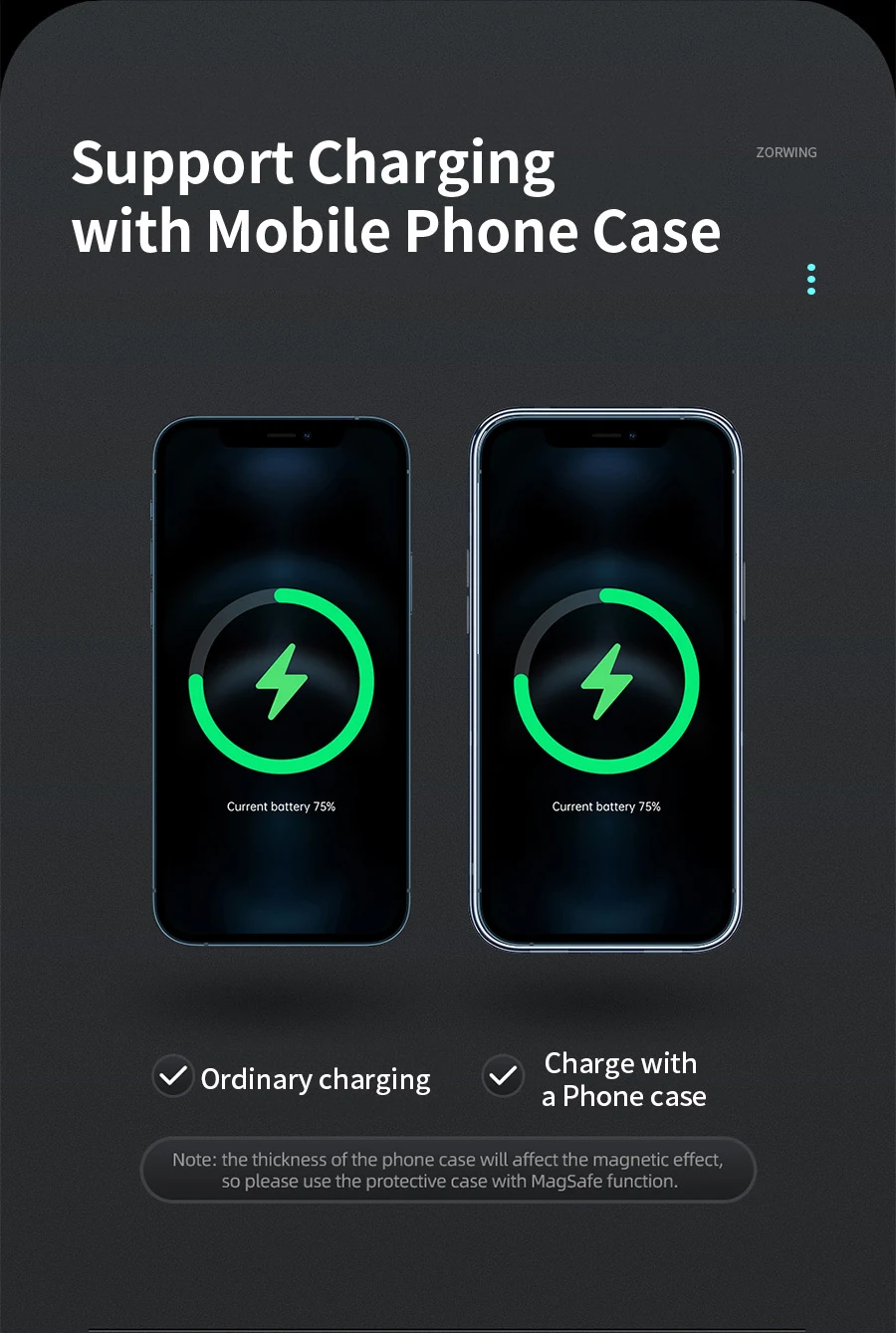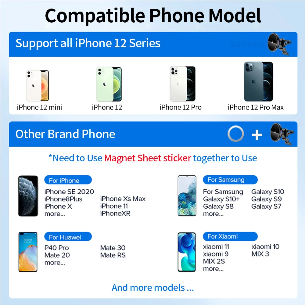 15 Вт Qi магнитный автомобильный держатель для телефона с беспроводной зарядкой для iPhone 12 Pro Max Mini Беспроводное зарядное устройство Держатель подставка с металломТехнические характеристикиМодель: ZR-D7SНаименование: магнитное беспроводное автомобильное зарядное устройствоВход: 5 В/2 а 9 В/2 а 12 В/1,5 АВыходная мощность: 5 Вт/7,5 Вт/10 Вт/15 Вт (макс.)Выходной интерфейс: Type-CСовместимость: сотовый телефон с магнитной функцией Rr с магнитной чехол для телефонаФиксация положения: крепление на вентиляционную решеткуПрименяемые протоколы быстрой зарядки: Qualcomm Quick Charge 3,0Материал: АБС + ПоликарбонатЗарядное устройство: Универсальное для смартфона 4,7-6,5 ДюймовРасстояние зарядки: ≤ 8 ммКакие мобильные телефоны могут использовать?1.iPhone 12 серии мобильный телефон2. Другие телефоны Mobl: необходимо использовать Магнитный чехол или магнитные листы, а затем можно использовать в обычном режимеОсобенности1. Механически нажмите, чтобы открыть, одна кнопка для блокировки, стабильная и твердая без аномального шума.2. Использование одной рукой, удобно и быстро.3. Вращение на 360 градусов, угол обзора можно регулировать произвольно, горизонтальный и вертикальный экраны свободны для вас.4. Подходит для 4,7-6,5 дюймовых мобильных телефонов, Высокая совместимость.5. Крепление на вентиляционную решетку с пятью фиксаторами.6. Беспроводное быстрое зарядное устройство 15 Вт для Мобильный телефон с MagSafe чехол для телефона7,7 шт. 45 ° настраиваемое и постоянное магнитное поле, минимизирующее воздействие на сигнал мобильный телефон и скорость зарядки.8. Магнитное Беспроводное зарядное устройство автоматически точно соответствует магнитному модулю iPhone 12 плотно адсорбирует, стабильно и надежно