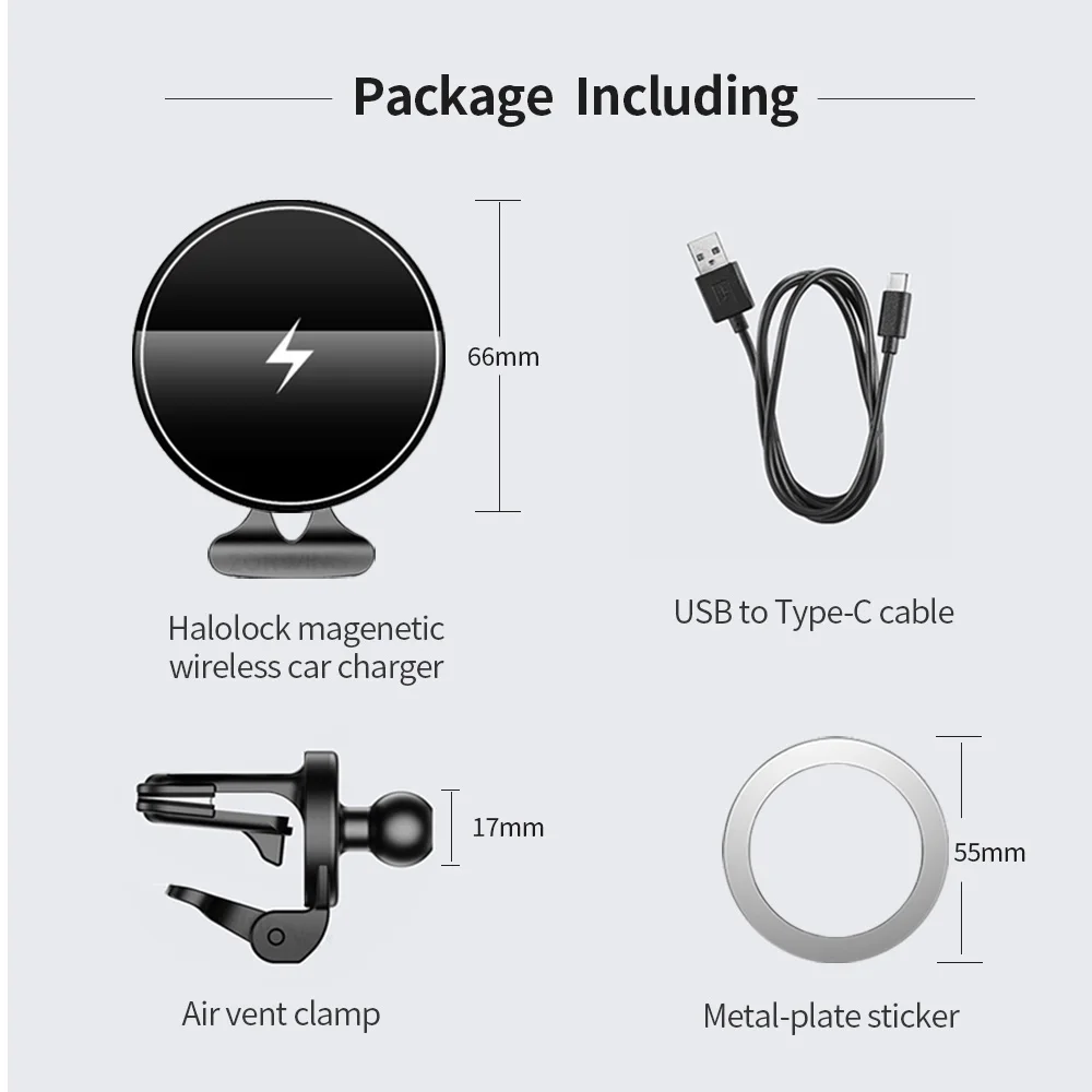 Посылка входит: 1* Беспроводное зарядное устройство Автомобильный держатель для телефона, 1 * кабель Type-C, 1 * металлическая пластина стикер