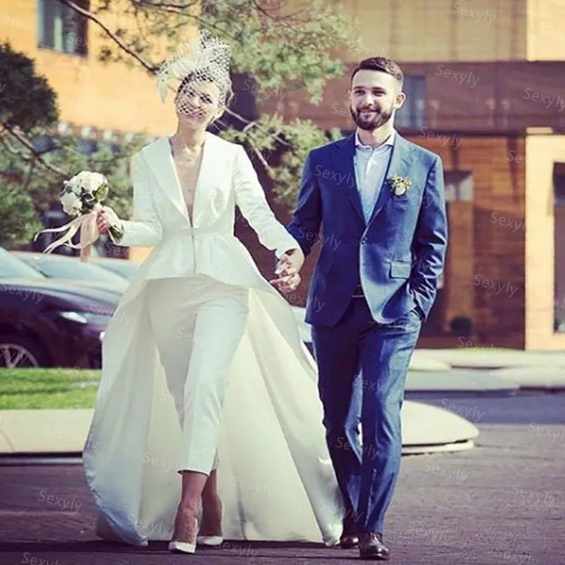 Женский атласный комбинезон со шлейфом, белое платье с глубоким V-образным вырезом и длинным рукавом, в богемном стиле, одежда для свадьбы, 2021