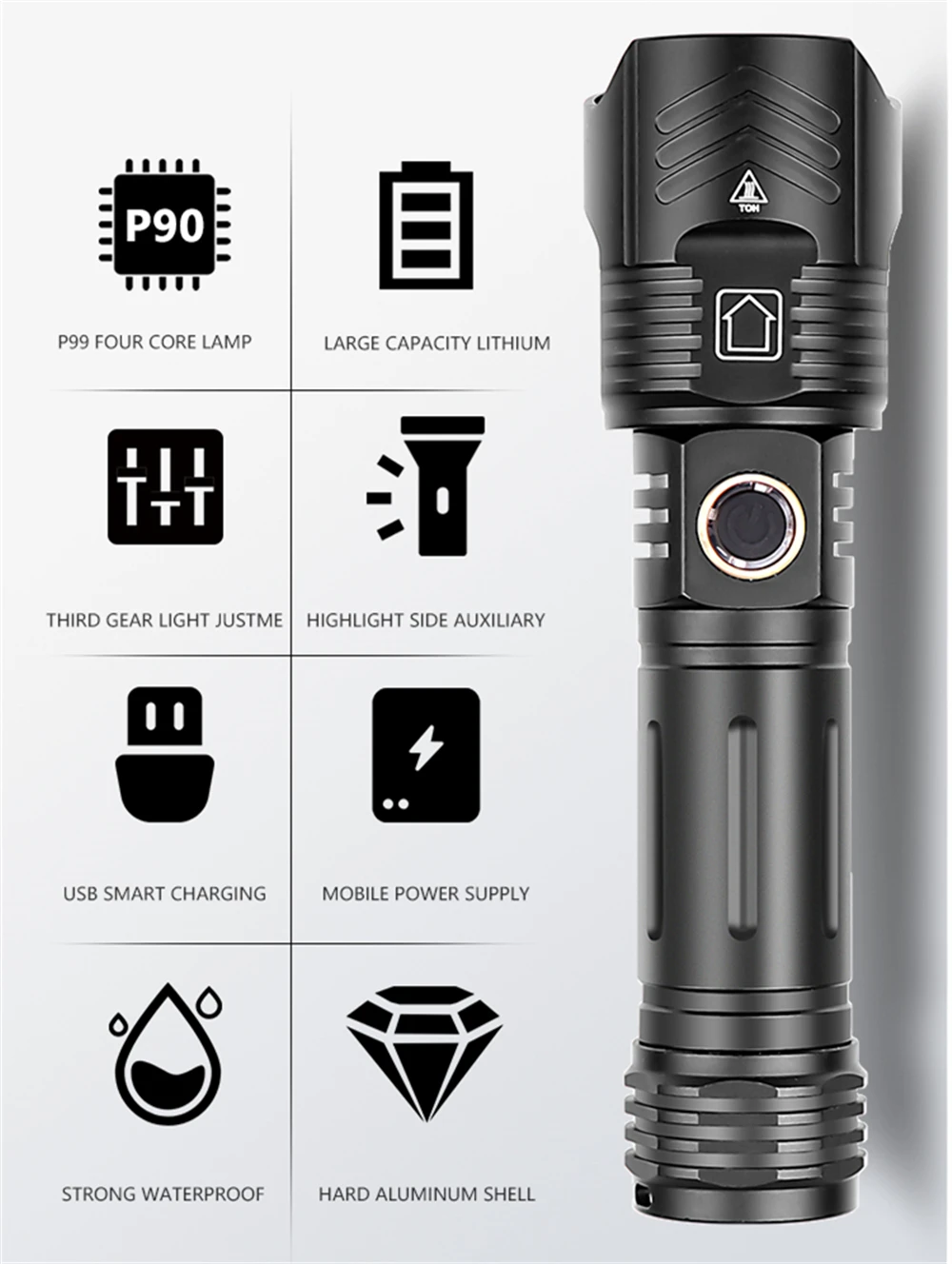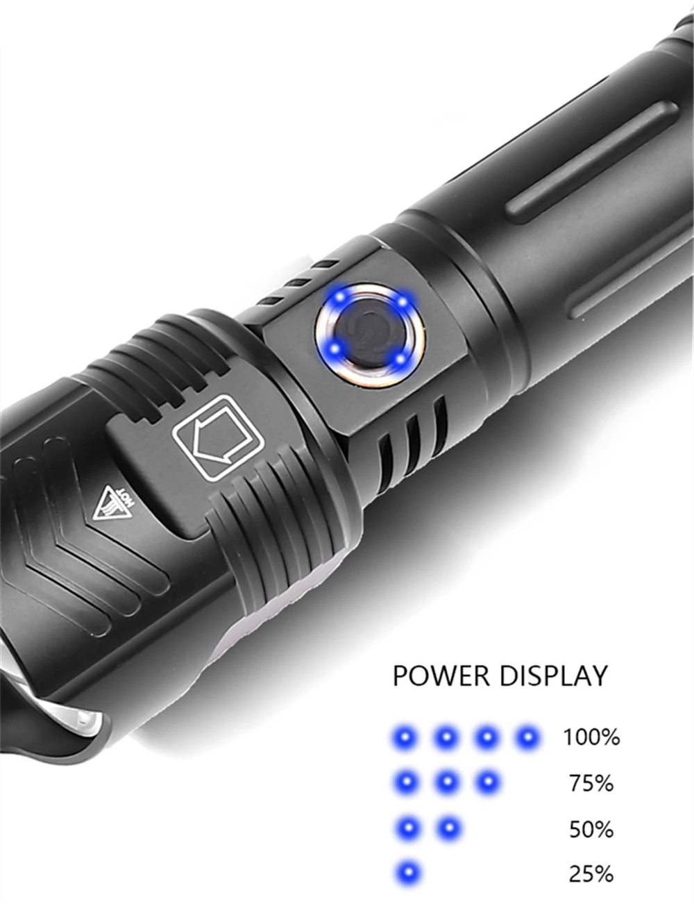 -Мощный светодиодный фонарик с использованием лампы XHP50.2-На 1*18650 или 1*26650 батарейный отсек, чтобы продлить время работы.-Дисплей емкости аккумулятора.-Телескопический зум-Микро-usb для компьютера usb, Автомобильный USB, usb-разъем для зарядки, зарядный фонарик-Изготовлен из авиационного алюминиевого сплава прочный HAIII военный класс Жесткий-анодированный-IPX-6 водонепроницаемый, водостойкий, может использоваться в дождливую погоду, но не может положить его в воду-Подходит для работы, охоты, альпинизма, рыбалки, кемпинга и активного отдыха и т. д.-Ударопрочный до 2 метров