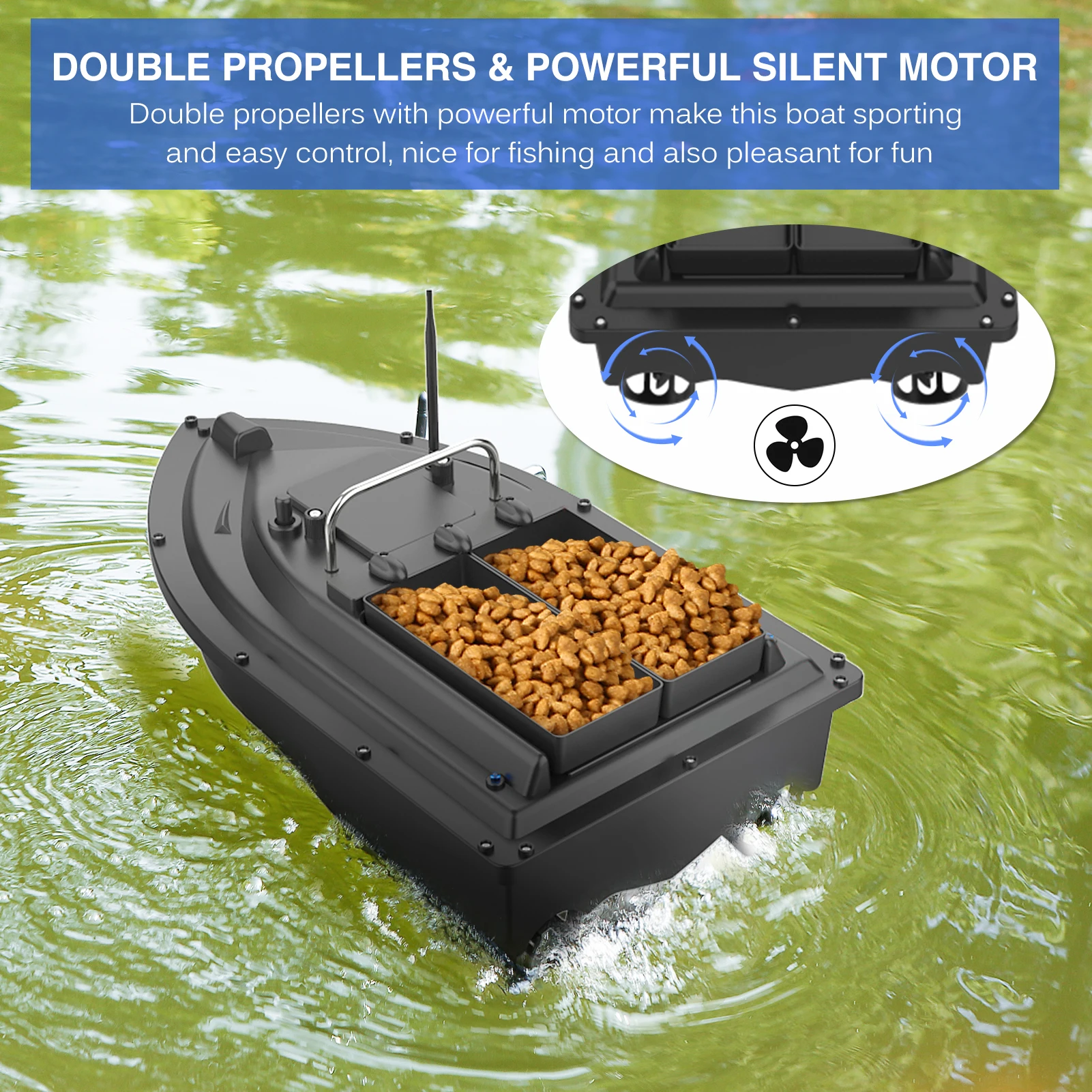 2 контейнера для приманки с грузоподъемностью около 2 кг для большего количества приманок.Беспроводное управление и фиксированный скоростной круиз-переключатель, дают возможность выпустить приманку далеко. (Радиус действия пульта: 400-500 м)Двойные моторы и двойные пропеллеры делают лодку легкой спортивной и кротроллинг.1 передсветильник и 2 задних синих ночника s для ночной рыбалки и кормления.Обтекаемый корпус уменьшает Водонепроницаемость и 5 уровней устойчивости к волнам.Лодка для прикормки работает от buit-in 5200mAh аккумуляторной батареи (входит в комплект).Пульт управления работает от двух батареек типа ААА (в комплект не входят).