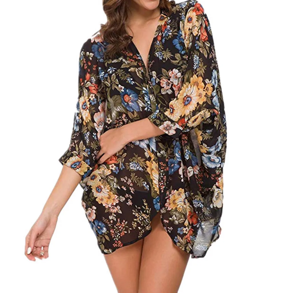 Женское шифоновое свободное кимоно с цветочным принтом, кардиган накидка, блузка