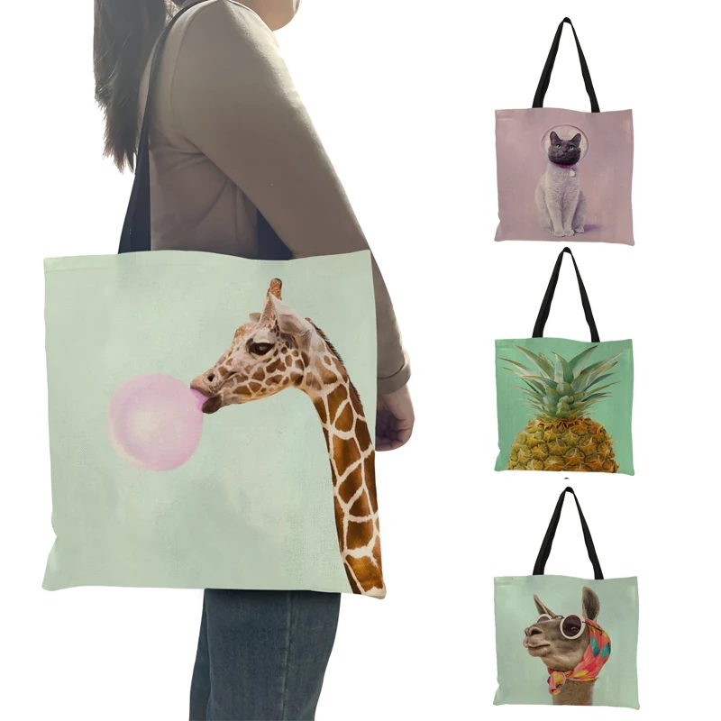 Сумка-тоут с акварельным рисунком животных, Повседневная льняная пр...