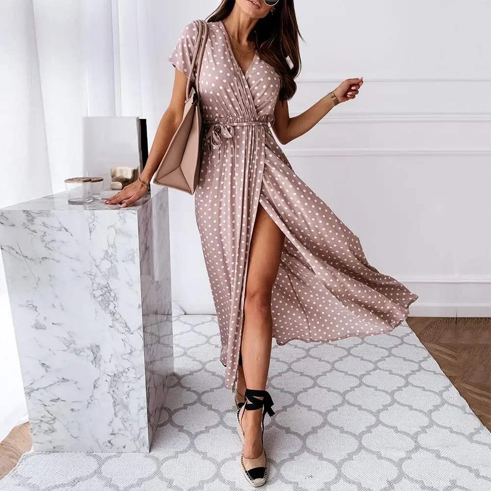 Женское платье с запахом, Летнее Длинное Платье с V-образным вырезом, коротким рукавом, поясом и принтом в горошек, с разрезом спереди, 2020