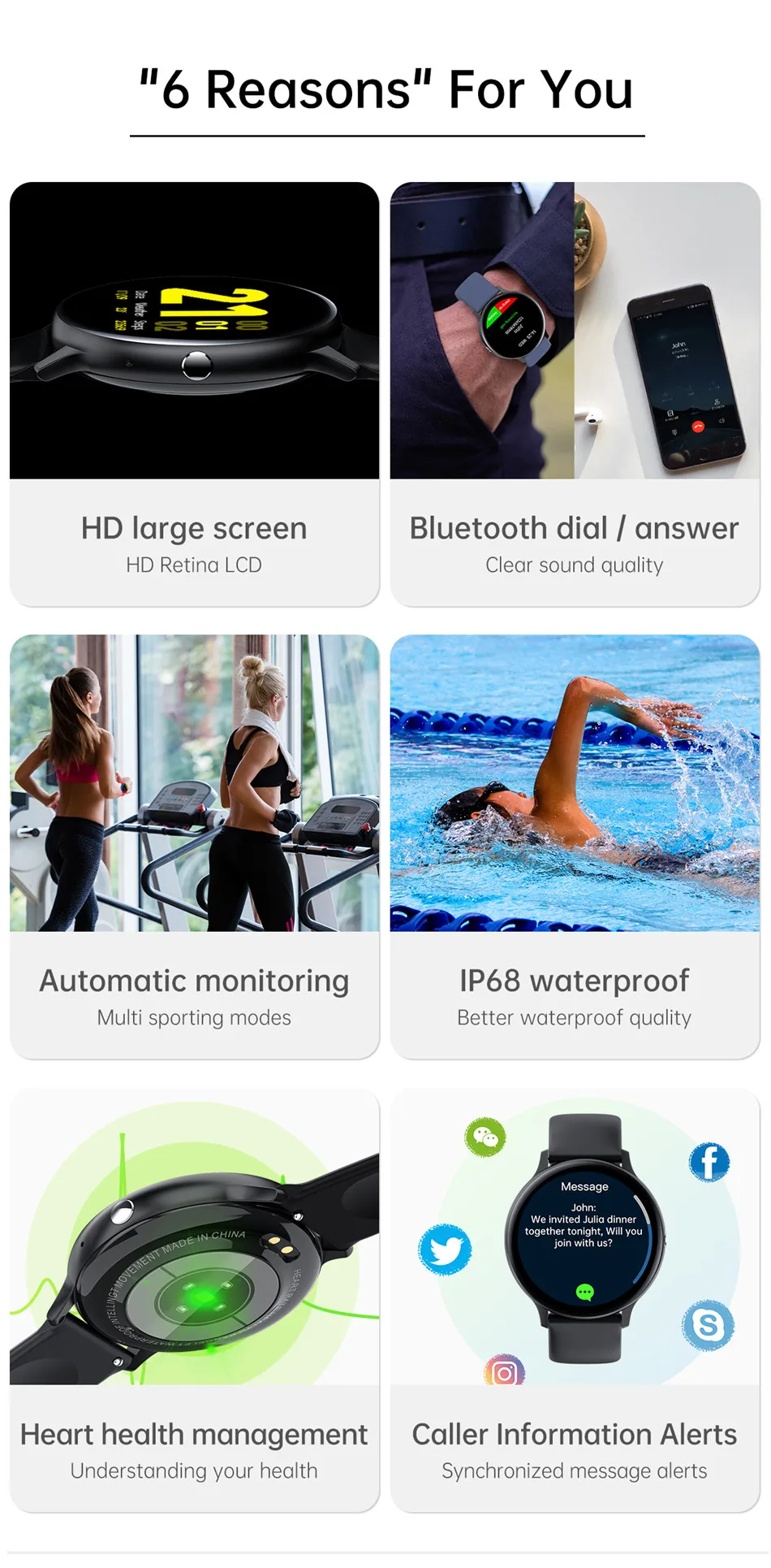 Прием/отклонение телефонных звонков/телефонных звонков с циферблатом, мониторинг сердечного ритма, мониторинг кровяного/кровяного давления, мониторинг сна, напоминание о сидячем положении, спортивный шагомер/потребление калорий/запись отслеживания/время упражнений, напоминание о звонках и отображение, сообщение толкается и отображается, камера дистанционного управления, Автоматическое Измерение частоты сердечных сокращений, измерение нескольких видов спорта, напоминание о часах, напоминание о тревоге, 5 видов циферблатов по умолчанию. Индивидуальные Циферблаты часов в приложении являются необязательными.
