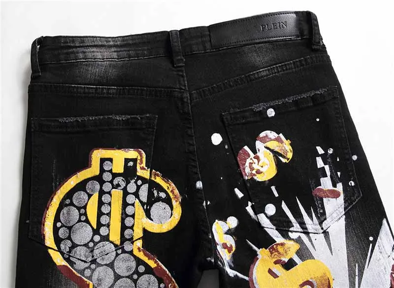 Новые Брендовые мужские облегающие джинсы, черные брюки с принтом и сломанными дырками, модные брюки с рисунком, рваные джинсовые брюки на осень-зиму