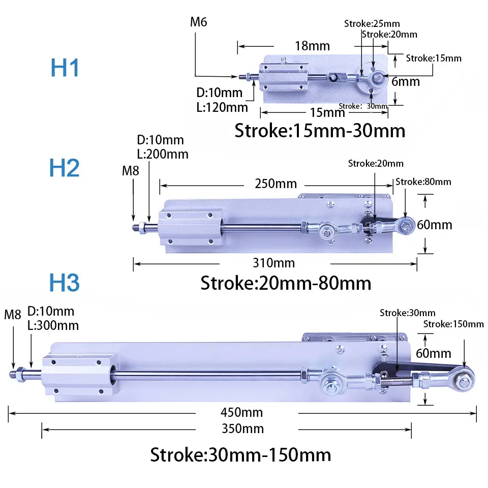 H1: Размер: 15 см * 6 см, Вес нетто: 0,68 кг, телескопическое расстояние: 1,5 см, 2 см, 2,5 см, 3 см; Диаметр интерфейса Размер: M6;H2: Размер: 25 см * 6 см, Вес нетто: 1,05 кг, телескопическое расстояние: 2 см-8 см; Диаметр интерфейса: M8;H3: Размер: 35 см * 6 см, Вес нетто: 1,35 кг, телескопическое расстояние: 3 см-15 см; Диаметр интерфейса: M8;