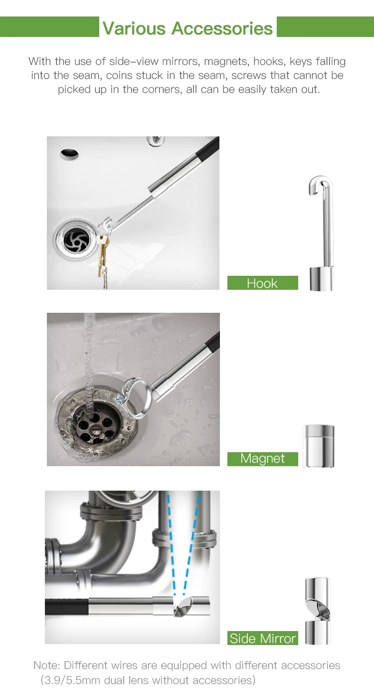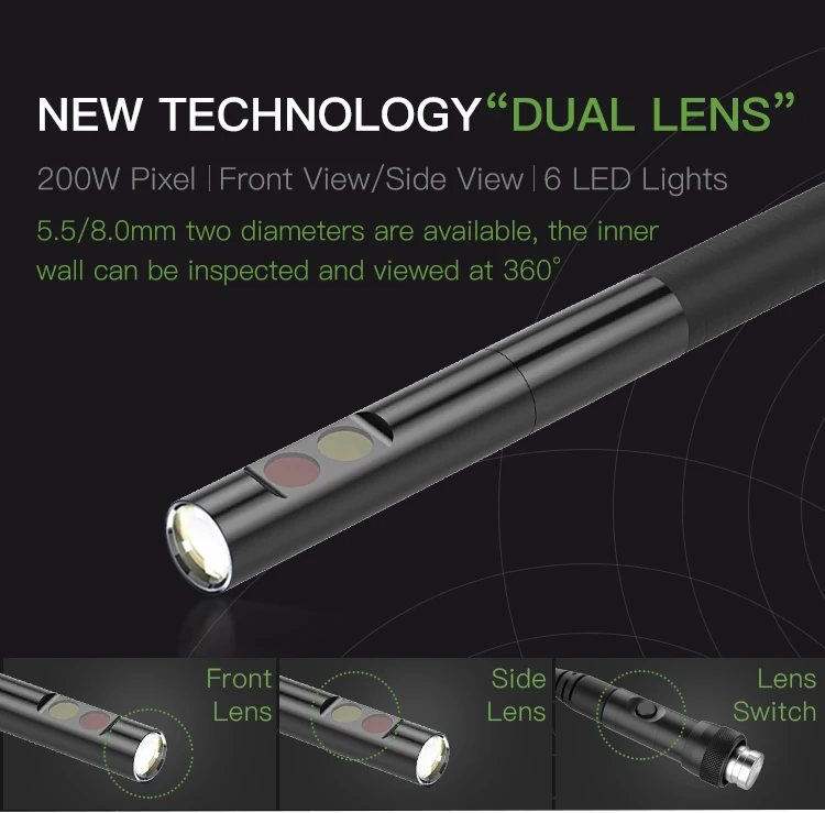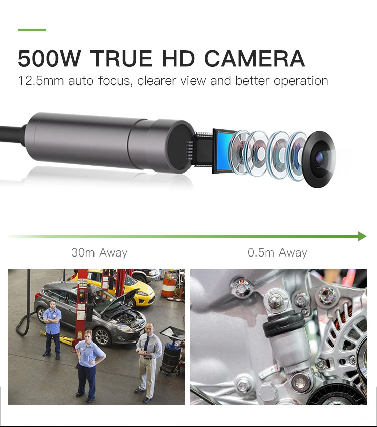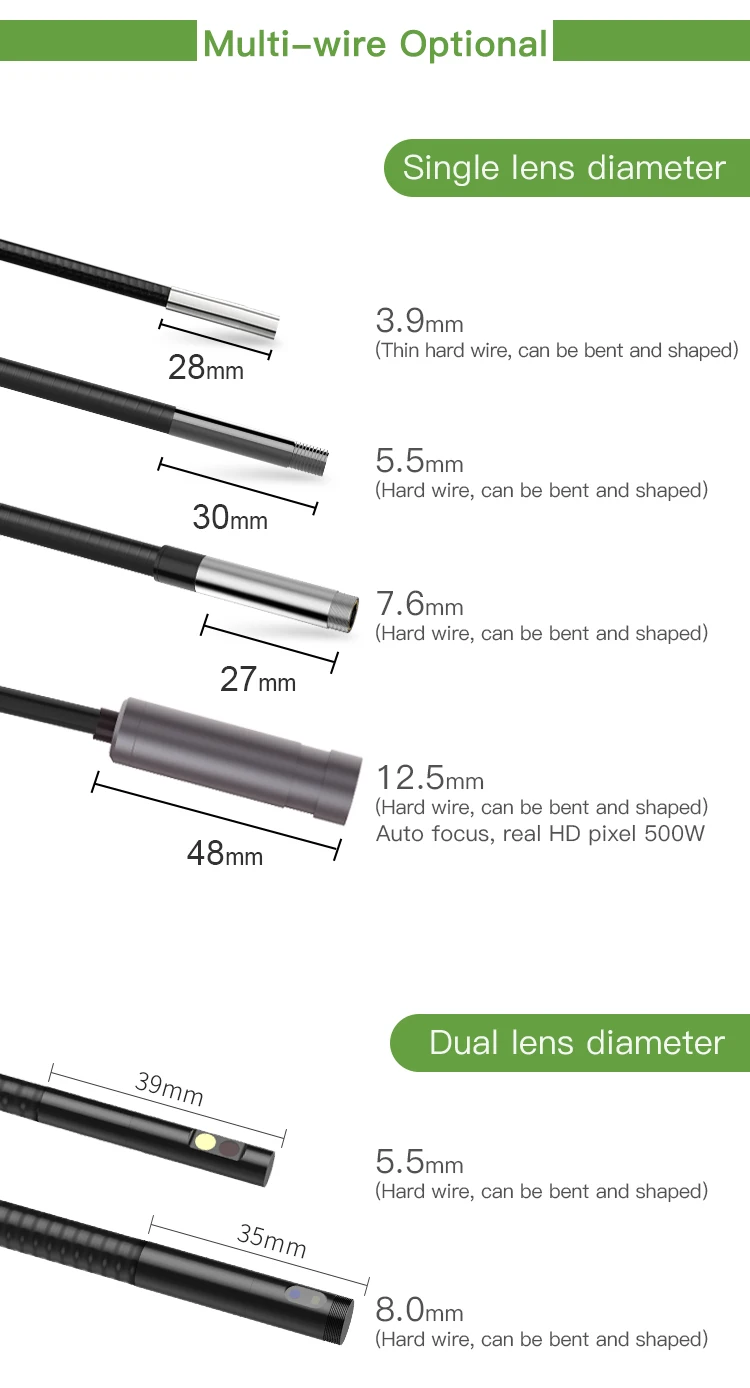 Диаметр: 7,6 мм/5,5 мм/3,9 мм опционально Диаметр вала: 7 мм/5 мм Длина вала: 100 см/300 см/500 см (полу-жесткий кабель) Разрешение: 1,0 мегапикселей Угол обзора: 70 ° Глубина поля: 30 мм-60 мм Светильник источник света: 6 Регулируемых светодиодов высокой интенсивности