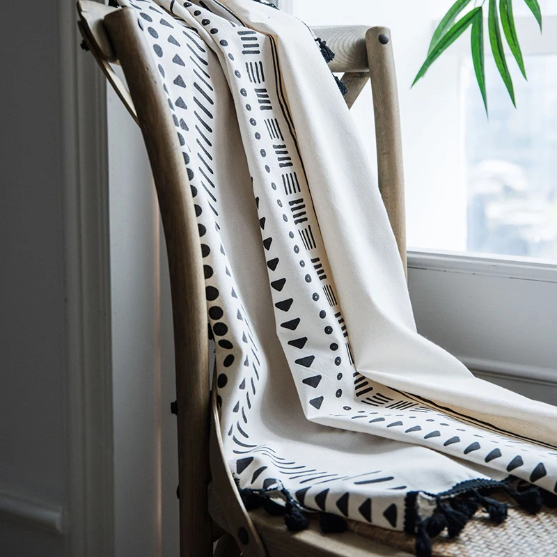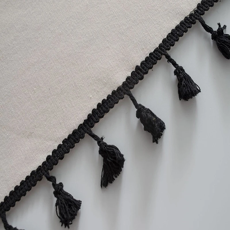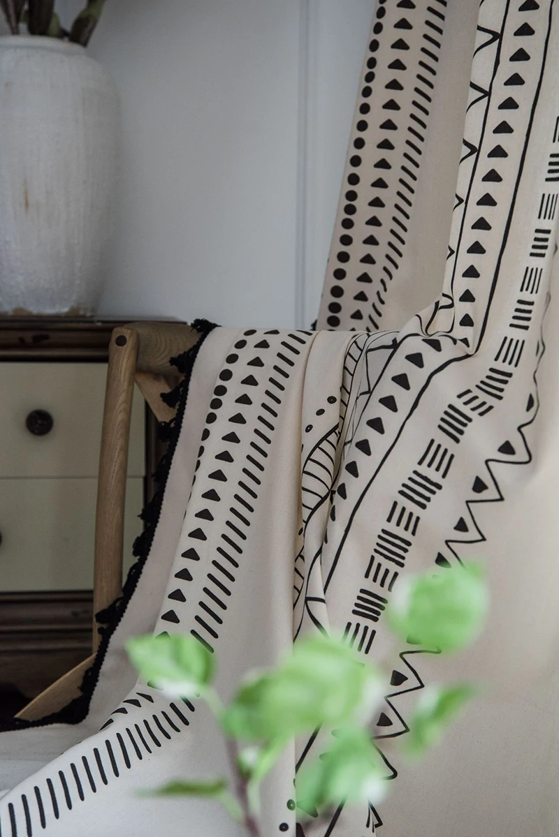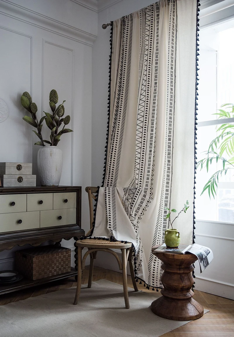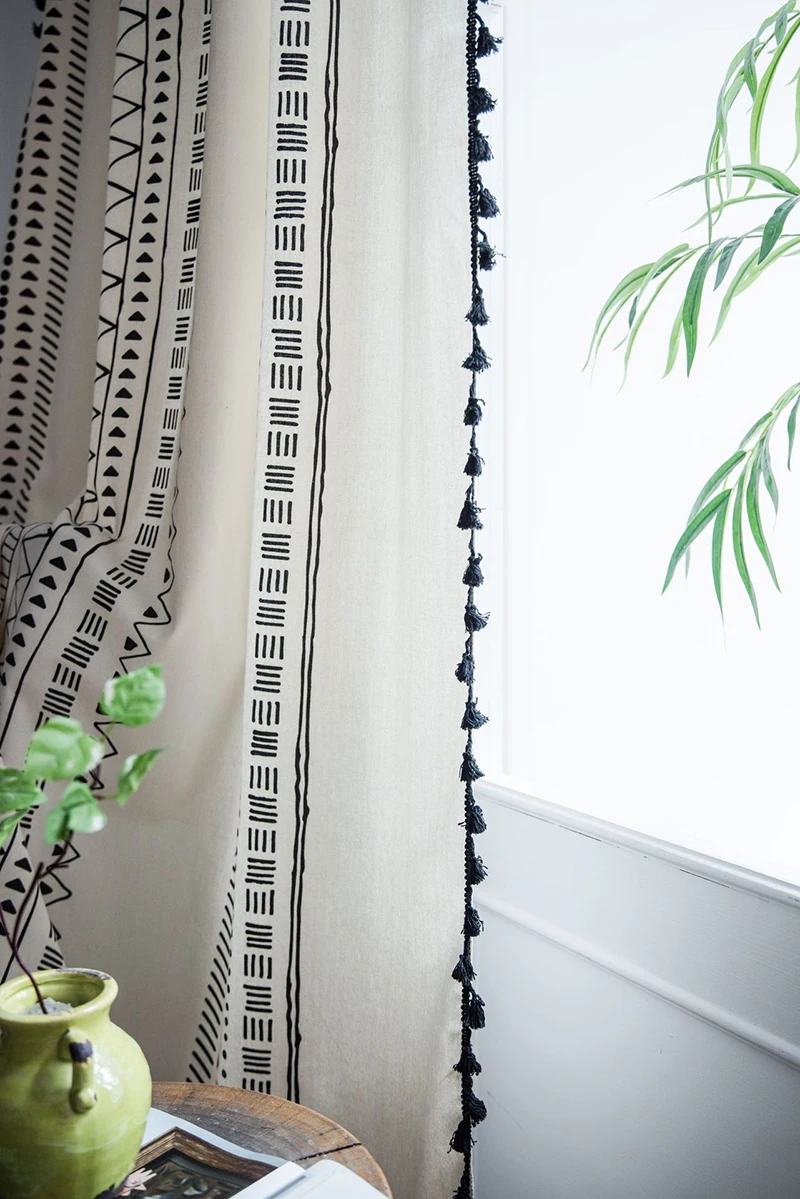 Шторы на окна из хлопка и льна с черной кисточкой в богемном стиле