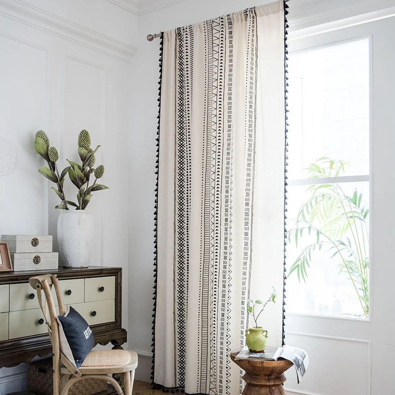 Занавески из хлопка и льна с черной кисточкой для гостиной, спальни, занавески на окна в стиле бохо, в этническом стиле, готовые занавески для кухни
