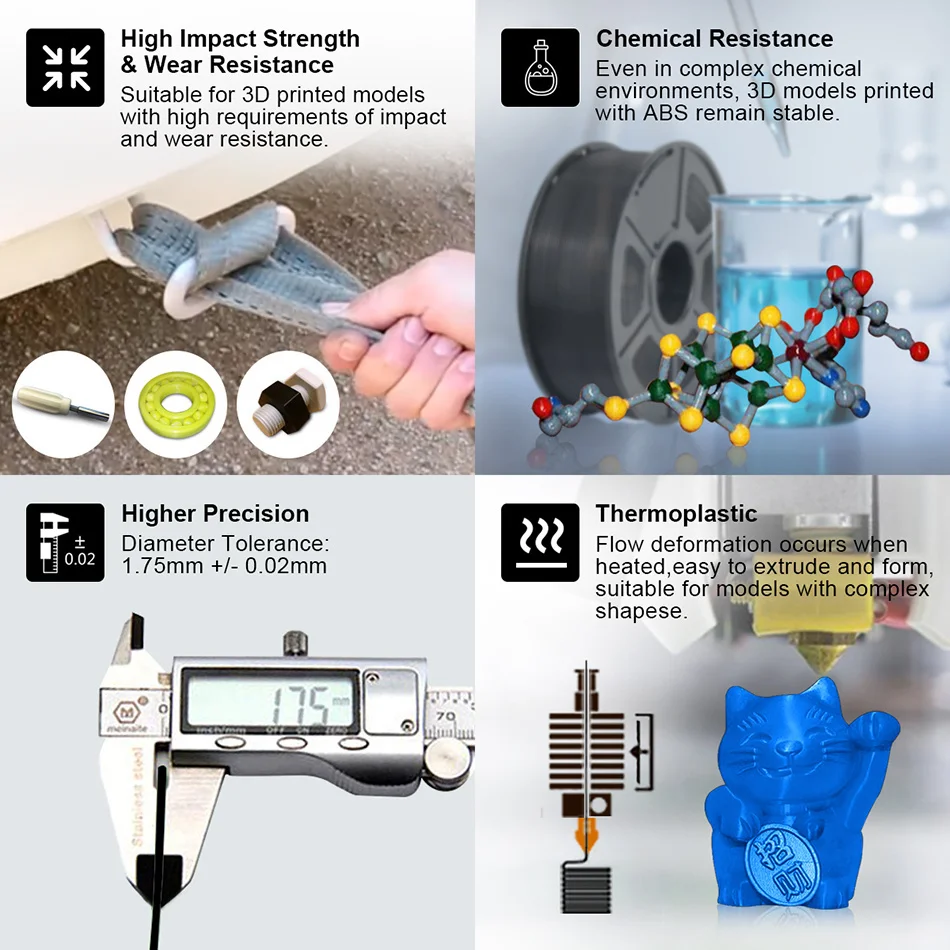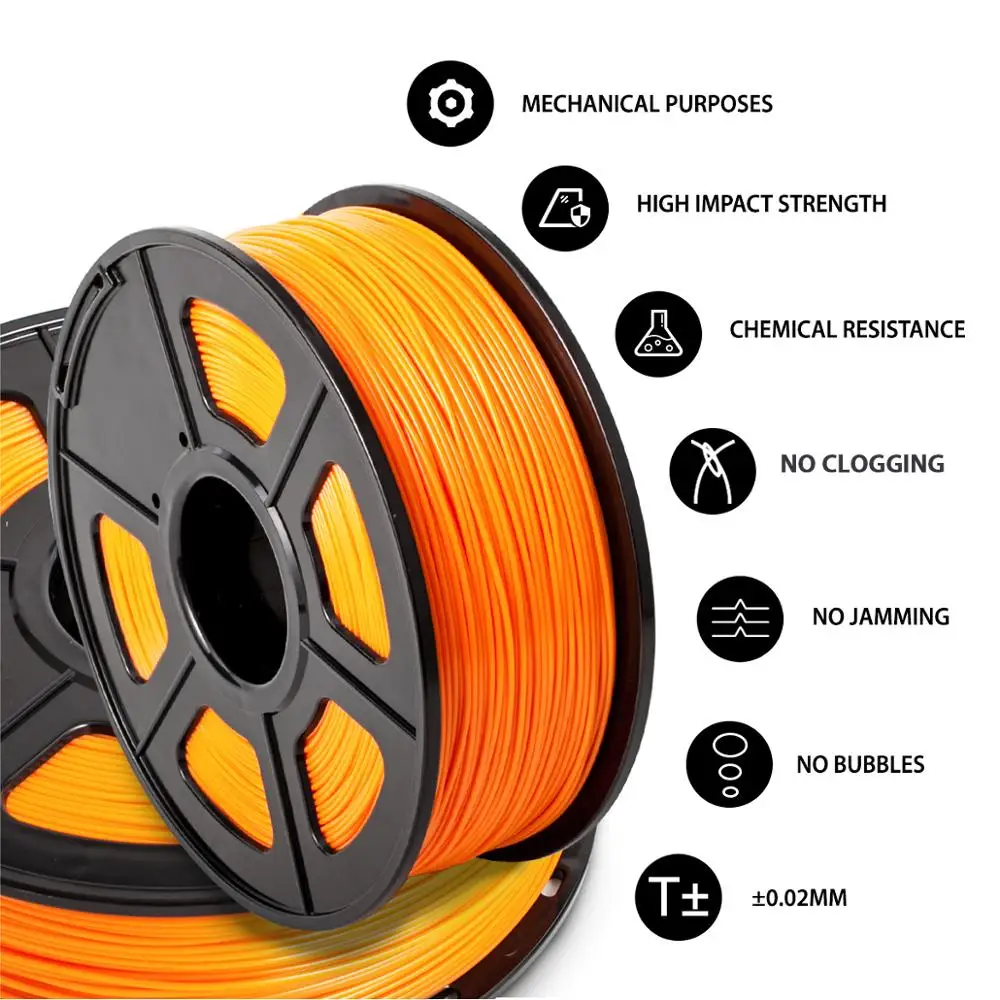 ABS нить отличная ударная прочность, стойкость к истиранию, химическая стойкость и крашение. Легко перемещать поддерживающий материал. Совместимые принтеры должны иметь нагревательное устройство, могут печатать модели имеют строгие требования к прочности и необходимости процесса, такие как: окрашивание, полировка, Гальваника и т. Д. Хорошо подходит для печати мелких деталей и т. Д. 100% без Пузырькового 3d материала принтера.