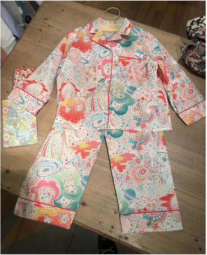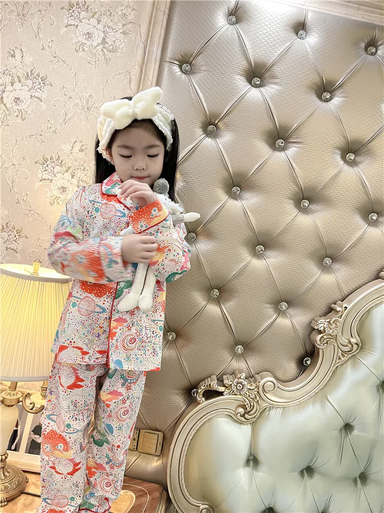 Пижамный комплект принцессы с отложным воротником для девочек, детский пижамный комплект с цветным принтом планеты, кардиган, одежда для сна, детская одежда