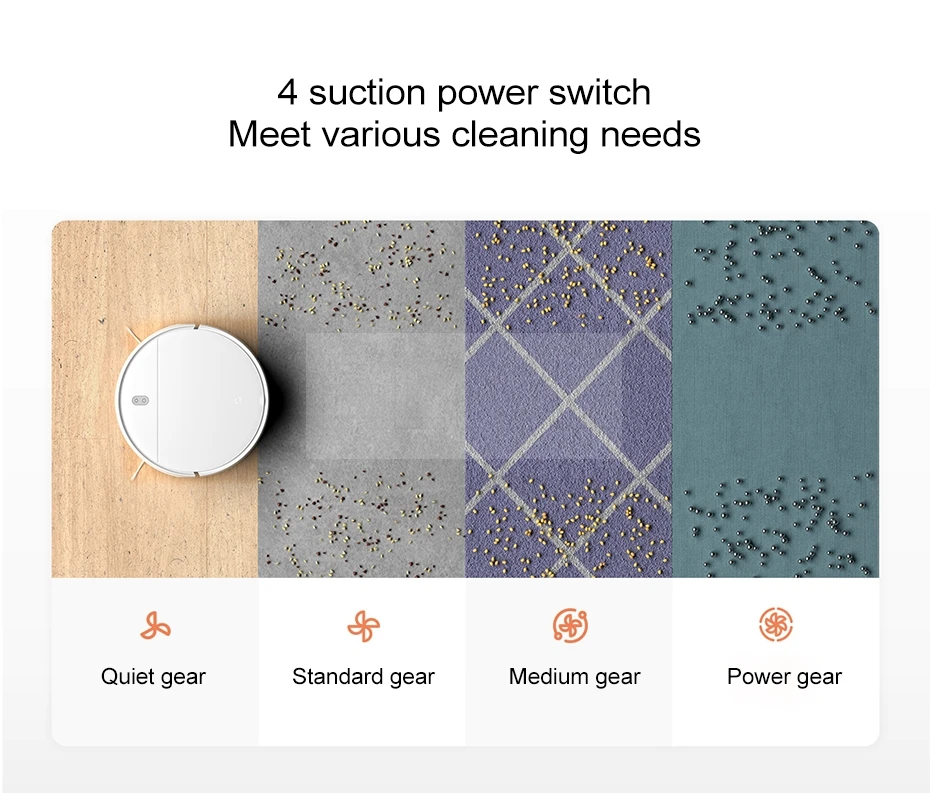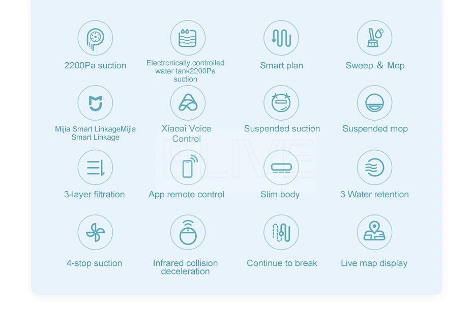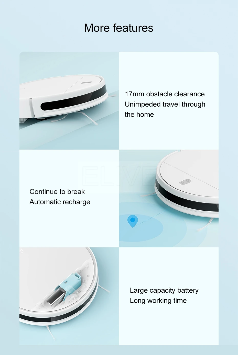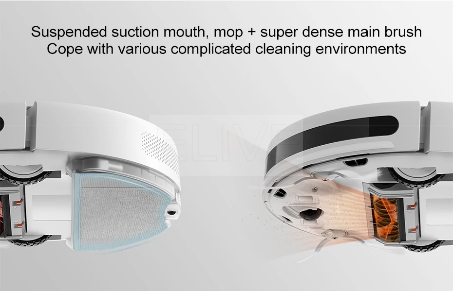 * 2200Pa большая мощность всасывания, глубоко в зазоре и Эффективная очистка. * 4 вида всасывания для удовлетворения различных потребностей в очистке. Elive * Резервуар для воды с электронным управлением, 3 режима выхода воды, уход за полом. * Подвесной всасывающий рот, швабра и плотная основная щетка могут легко справиться со всеми видами земли. * 3-х слойной система фильтрации эффективно фильтрует солнечные лучи пыли. * 82 мм Ультратонкий корпус, * Интеллектуальная навигация и точное позиционирование. Создайте карту всего дома в реальном времени. * Подключение приложения MIJIA, дистанционное управление. * Аккумулятор большой емкости 2500 мАч, длительный срок службы батареи.