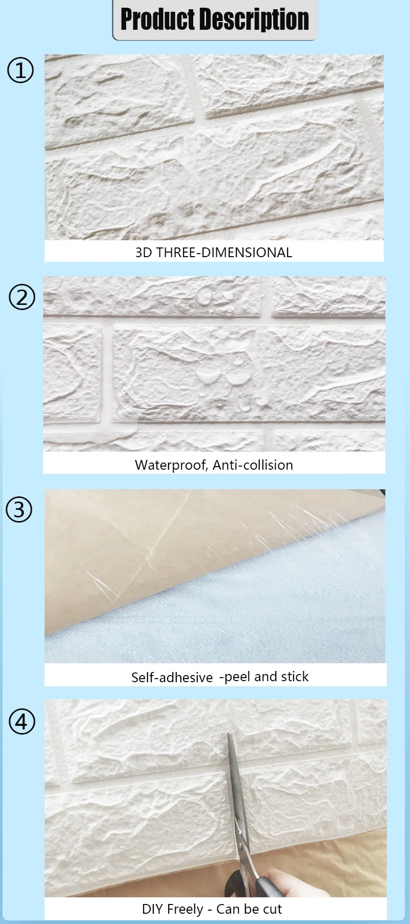 Описание:<Высокое качество: Изготовлен из высококачественного пенопласта XPE, защищает от столкновений детей, заботится о вашей семье. Водонепроницаемость, защита от влаги и звукоизоляция. Легкая чистка и обслуживание, нетоксичный, без запаха.<Самоклеящаяся конструкция: самоклеящаяся кожура и наклеиваемые обои, легкая паста и съемка.<Безопасно для вашей семьи: материал 3D кирпичной пены является безопасным, нет обнаружения вредных тяжелых металлов, высокое качество экологических стеновых декораций панелей.<Применение: Идеально подходит для стен, ТВ-стен, диванов, гостиной, спальни, кухни, детской комнаты, лестниц, столовой и так далее.<Идеальный декор: 3d-эффект и текстура, текстура 3D обоев сделана из мягкого пеноматериала XPE.<Простая установка:1. Тщательно очистите поверхность.2. Снимите клеевую пленку и приклейте обои к поверхности.3. Мягко гладьте обои, чтобы обеспечить их безопасность4. Разгладьте любые воздушные пузыри, когда вы двигаетесь вниз.