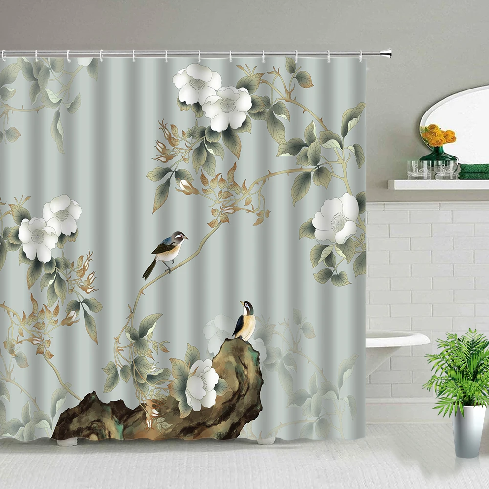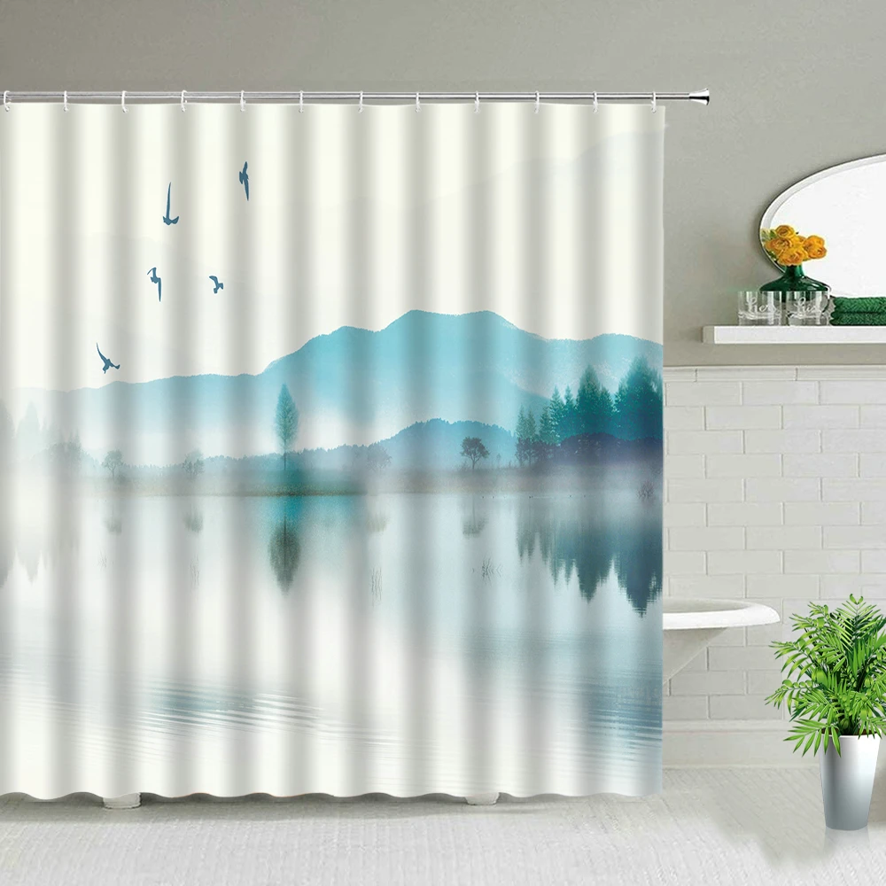 Занавеска для душа с бамбуковым пейзажем, водостойкая, с крючком, в китайском стиле
