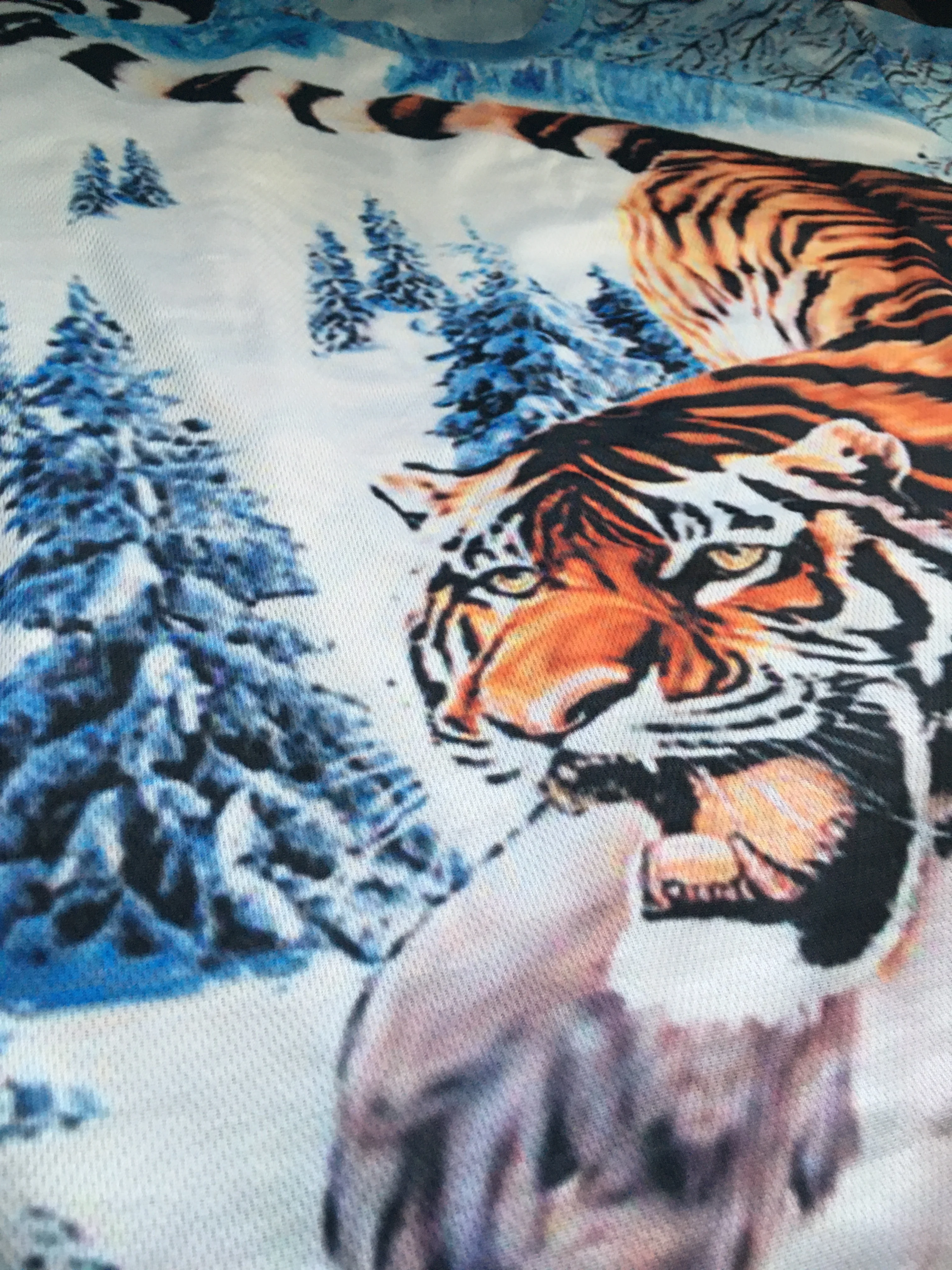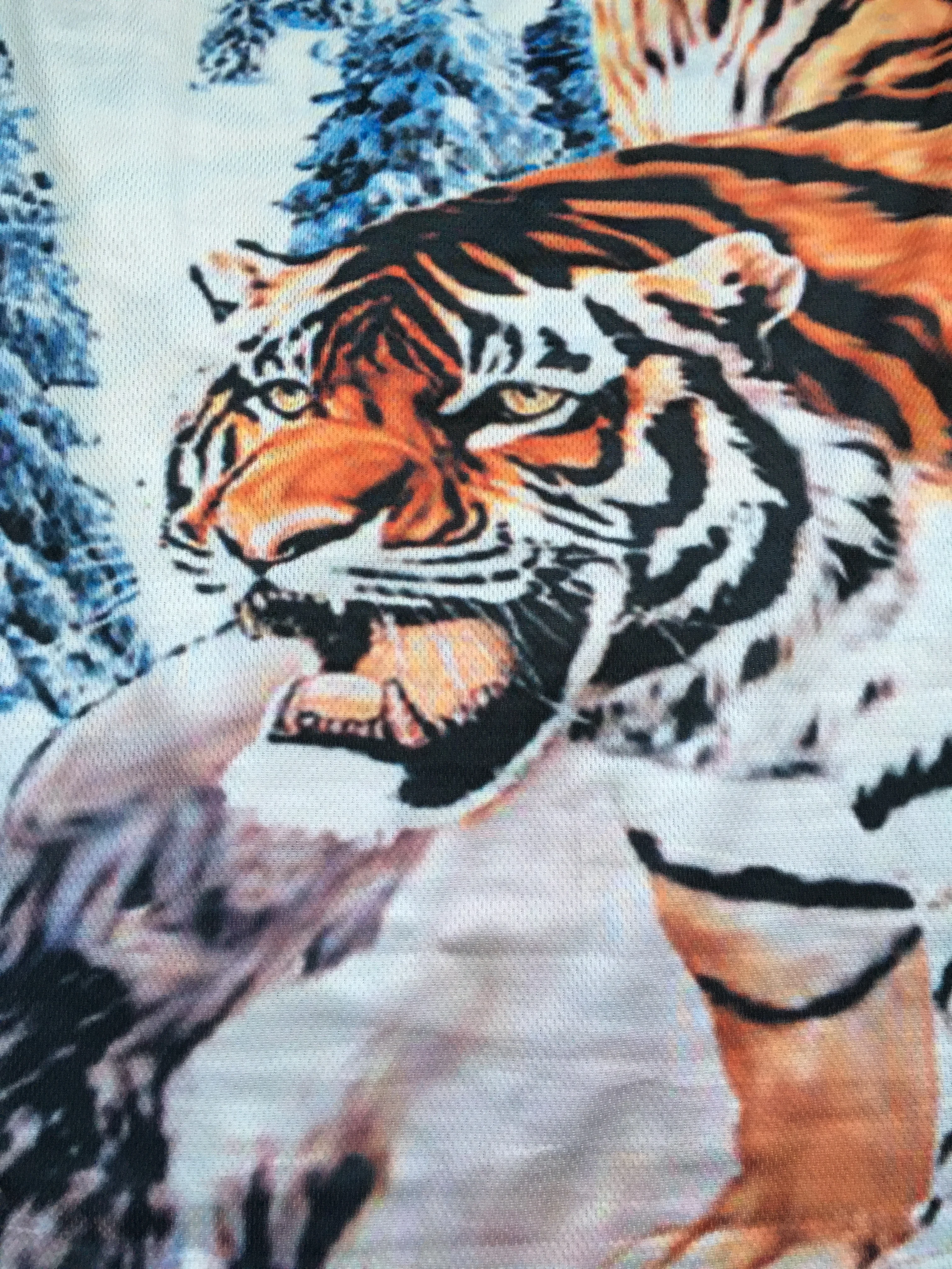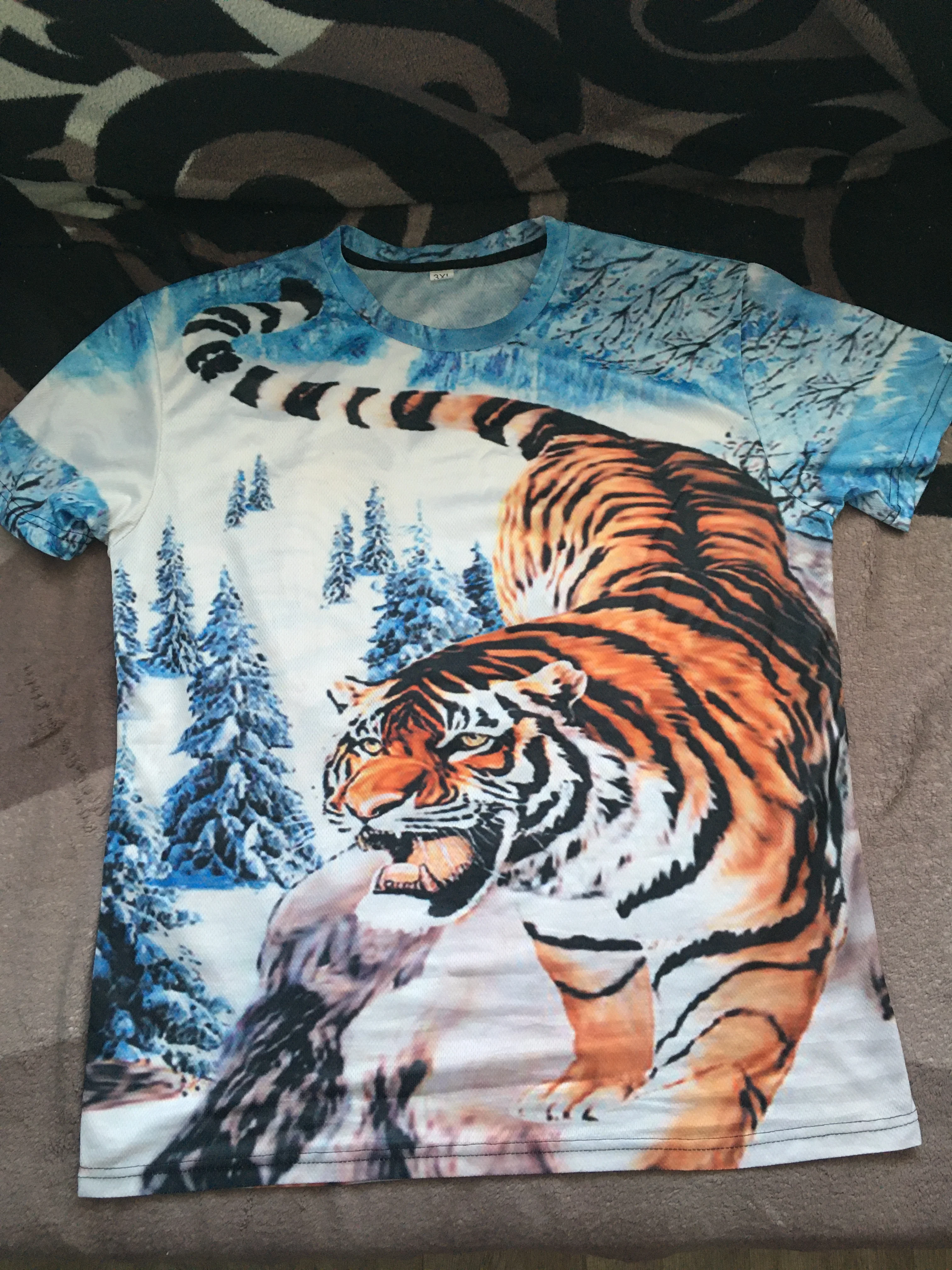 По ткани приятная на ощупь, хоть и синтетическая. Носить приятно. Но главный и основной минус - картинка не очень яркая, рисунок искажен, растянут, четкости мало, всё расплывчато. Ощущение, что нужно брать картинку для печати с большим разрешением пикселей. Размер хорошо подошел, футболка довольно длинная.