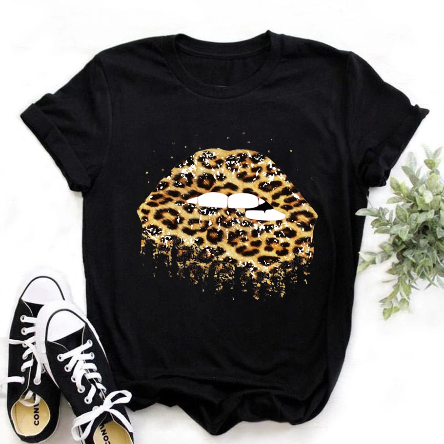 Женская футболка с коротким рукавом, принтом губ и круглым вырезом