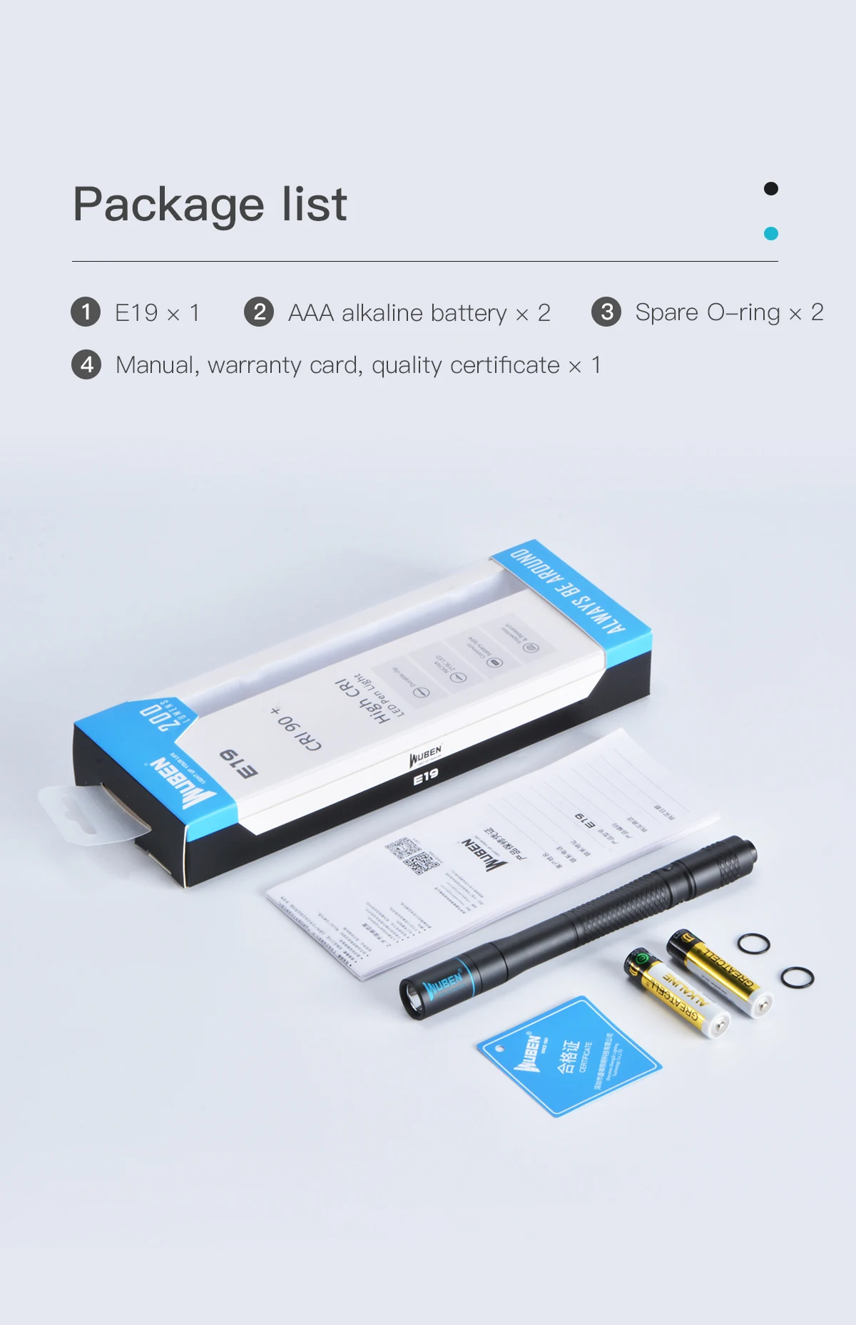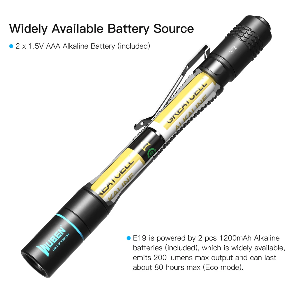 【Высокая цветопередача с 200 люменов Output】Светодиодный светильник WUBEN E19 с высокой цветопередачей NICHIA 219C (Ra>90), питается от 2 щелочных батарей AAA (в комплекте), излучает светильник луча до 200 люменов, это очень выдающийся выход для высокого CRI pen светильник. С высоким CRI светодиодный, E19 покажет цвет деталей более ближе к их первоначальному цвету, позволяет медицинскому персоналу, первые ответчики или другие специалисты, чтобы увидеть каждую деталь объекта и помочь им сделать точный осмотр.