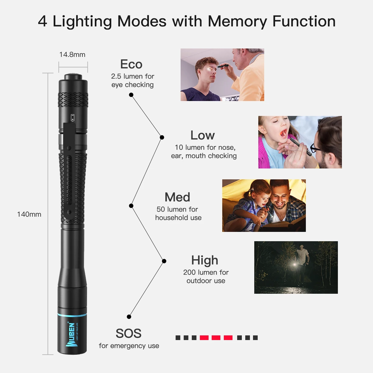 【 4 режима освещения с режимом запоминанияWUBEN E19, как мини-фонарик для осмотра, имеет 4 режима освещения для различных случаев и использования: Eco/Low/Med/High. Например, вы можете использовать высокий режим (200 лм) для ночной ходьбы, средний режим (50 лм) для ремонта, низкий режим (10 лм) для диагностики уха или рта, экологический режим (2,5 лм) для диагностики глаз. Он также имеет функцию SOS для экстренного использования.
