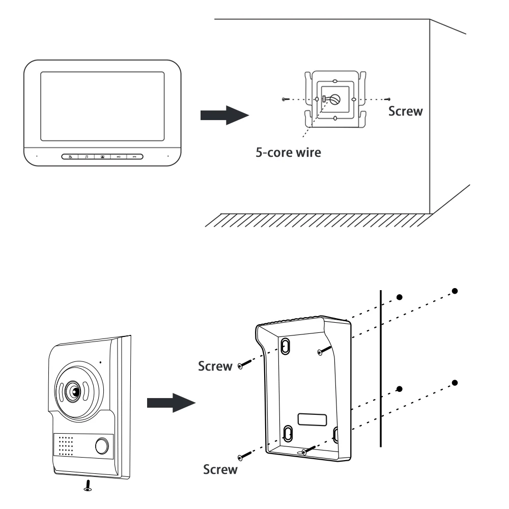 Продукт представляет собой проводную цветную систему видеодомофона. Система состоит из двух частей, наружного блока и внутреннего блока. Два блока соединены с четырехъядерным кабелем. 15 В постоянного тока используется для внутреннего блока для реализации функций