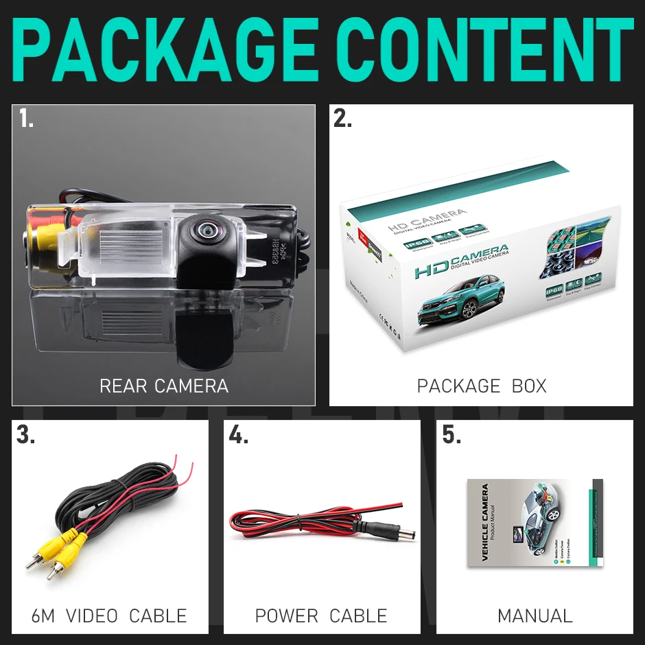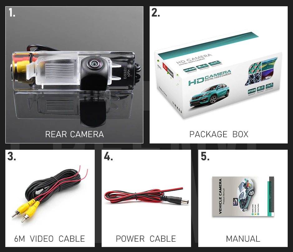 1. Задняя камера2. Коробка для посылка3. Видео кабель (6 м)4. Кабель питания5. Руководство пользователя