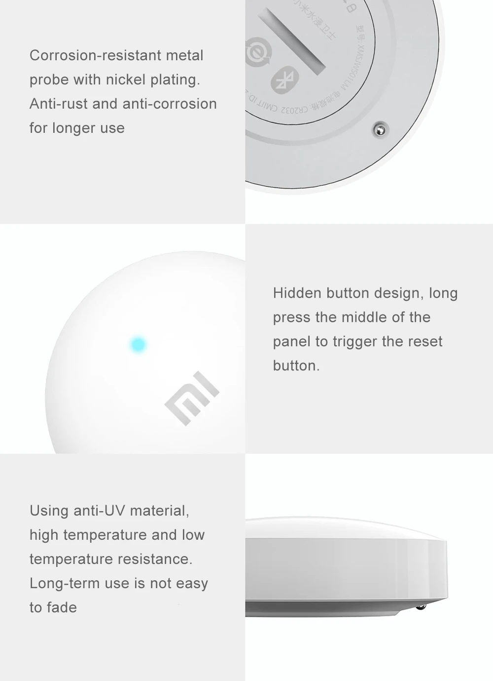 Датчик утечки воды Xiaomi использует проводимость воды. Когда высота погружения воды достигает 1 мм, два металлических зонда образуют дорожку, которые могут быть соединены с другими интеллектуальными продуктами для отправки напоминаний (функция должна использоваться с шлюзом Bluetooth или сетчатым шлюзом Bluetooth), и своевременные меры реагирования, чтобы избежать больших потерь.