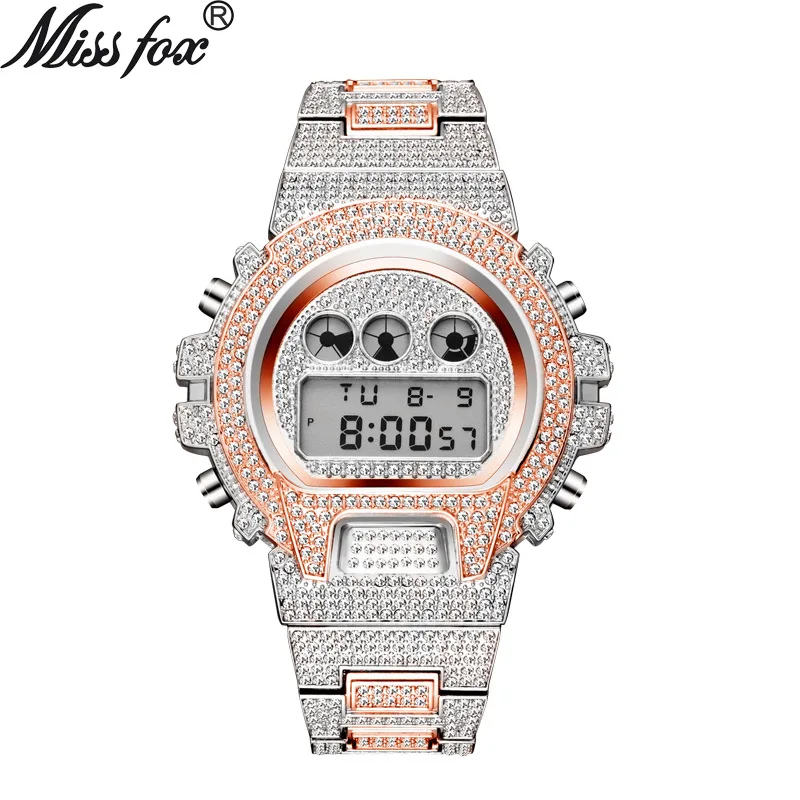 MISSFOX многофункциональная Стиль шок цифровой Для мужчин s часы Топ Элитный бренд светодиодный 18K золотые часы Для мужчин хип-хоп мужские льдом часы