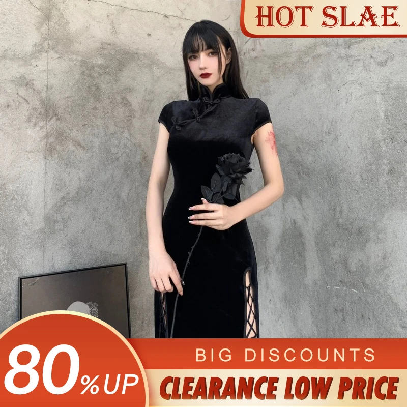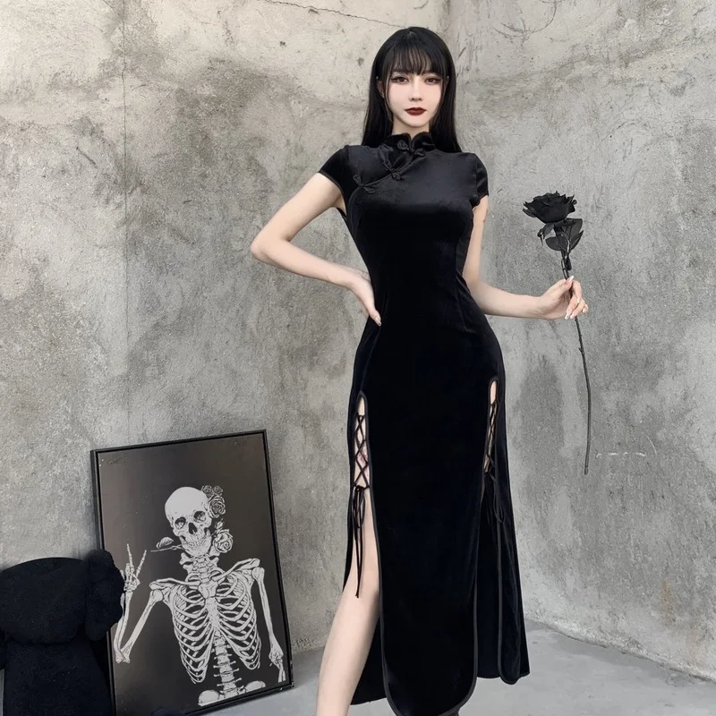 Женское бархатное платье с коротким рукавом, черное платье в готическом стиле, облегающее вечернее платье с разрезом, длинное платье чонсам, осень 2021