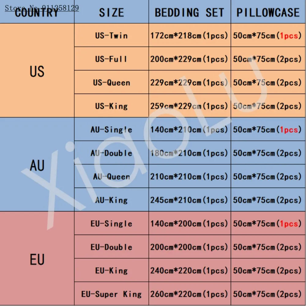 Доступные размерыРазмер СШАСША Twin (2 шт.) : 1 пододеяльник (172x218 см), 1 Наволочка (50x75 см).США (3 шт.) : 1 пододеяльник (200x229 см), 2 наволочки (50x75 см).Королева США (3 шт.) : 1 пододеяльник (229x229 см), 2 наволочки (50x75 см).Американский король (3 шт.) : 1 пододеяльник (259x229 см), 2 наволочки (51x91 см).ФлуоресцентныйЕвропейский размерЕвропейский стандарт (2 шт.) : 1 пододеяльник (140x200 см) ,1 Наволочка (50x75 см).Европейский двойной (3 шт.) : 1 пододеяльник (200x200 см), 2 наволочки (50x75 см).Европейский размер (3 шт.) : 1 пододеяльник (240x220 см), 2 наволочки (50x75 см).EU Super King (3 шт.) : 1 пододеяльник (260x220 см), 2 наволочки (50x75 см).ФлуоресцентныйАвстралийский РазмерAU Single (2 шт.) : 1 пододеяльник (140x210 см),1 Наволочка (50x75 см).AU Double (3 шт.) : 1 пододеяльник (180x210 см), 2 наволочки (50x75 см).AU Queen (3 шт.) : 1 пододеяльник (210x210 см), 2 наволочки (50x75 см).AU King (3 шт.) : 1 пододеяльник (245x210 см), 2 наволочки (50x75 см).Флуоресцентный