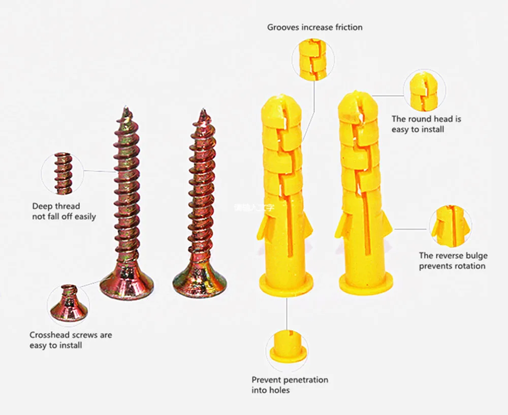 1. Сначала Просверлите отверстия на стене. Глубина и Диаметр отверстий должны соответствовать размеру изделия.2. Вставьте расширительный разъем в стену с помощью резинового молотка.3. Выровняйте анкерное отверстие с анкерным болтом.4. Вставьте винт и поверните по часовой стрелке, чтобы он был ровным с фиксированным предметом.