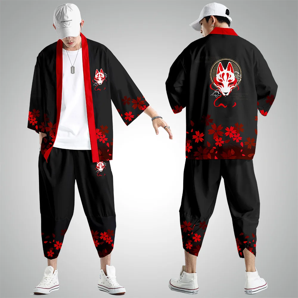 Кардиган-кимоно мужской с принтом Черной Лисы, юката, одежда самураев Повседневная Свободная уличная одежда, жакет, брюки, костюм женский