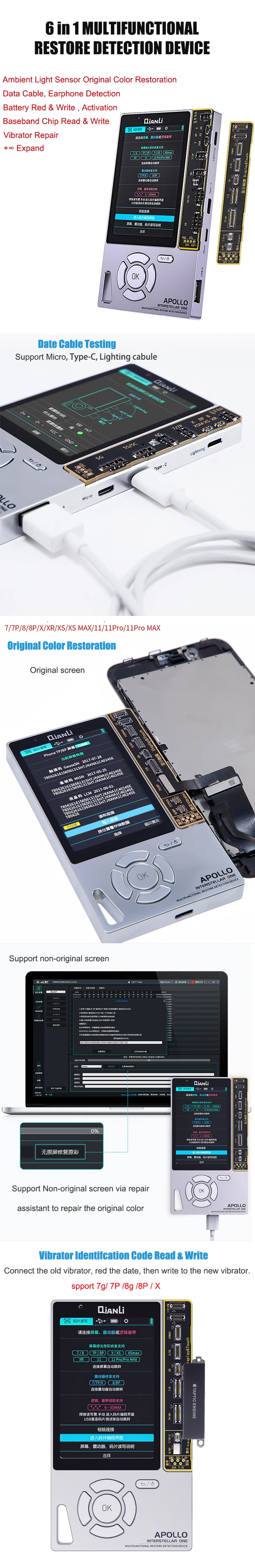 QIANLI APOLLO многофункциональный программист для ремонта истинного тона для iPhone 7 8 X XR XS MAX 11 Pro Аккумулятор вибрирующий датчик света писатель