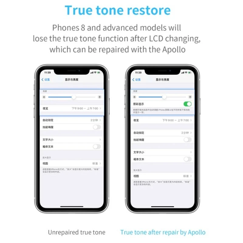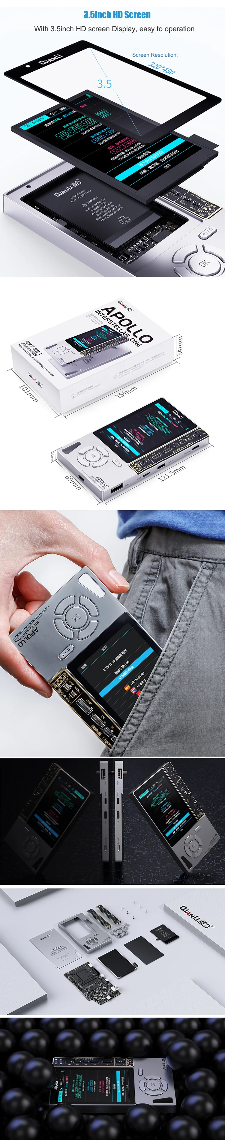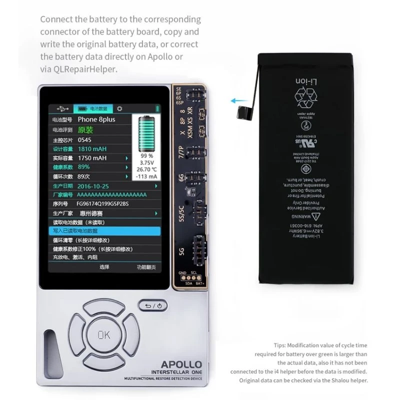 Описание: 1. 6 в 1 Многофункциональный тестер для ремонта 2. Светильник и датчик истинного тона 3. Обнаружение данных и гарнитуры 4. Поддержка истинного тона без оригинального жк-экрана 5. Вибратор SN чтение и запись 6. Считывание и запись микросхем Logic / Band 1. Уникальный дизайн ID, отверстие для шнурка добавлено, компактный и портативный без громоздких. 2. Большой экран с высоким разрешением, настроенные с 3,5 дюймов HD экран, более подробные данные могут быть отображены, подходит для больше операций и больше возможностей могут быть разработаны. Характеристика: 1. Обнаружение данных/гарнитуры: Независимые разъемы, чтобы избежать ложных данных, оригинал/IMF/анти-оригинал. Фальшивая индентификация через секунду. 2. Восстановление истинного тона: Телефон 8 и передовые модели потеряют функцию true tone после изменения ЖК-дисплея, который можно отремонтировать с Apollo. 3. Ремонт истинного тона с оригинальным ЖК-экраном: Подключите оригинальный ЖК-дисплей и переключитесь на светильник интерфейс датчика, затем нажмите кнопку «ок», чтобы ознакомиться с сохранение данных, Подключите Новинка экран, нажмите вниз для записи данных.