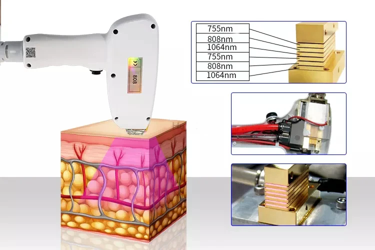 2.808нм + 755нм + 1064нмТри длины волны лазера в сочетании для всех типов кожи 755 нм для удаления волос белой кожи 1064 нм для удаления черных или темных волос 808 нм для другого типа удаления волос