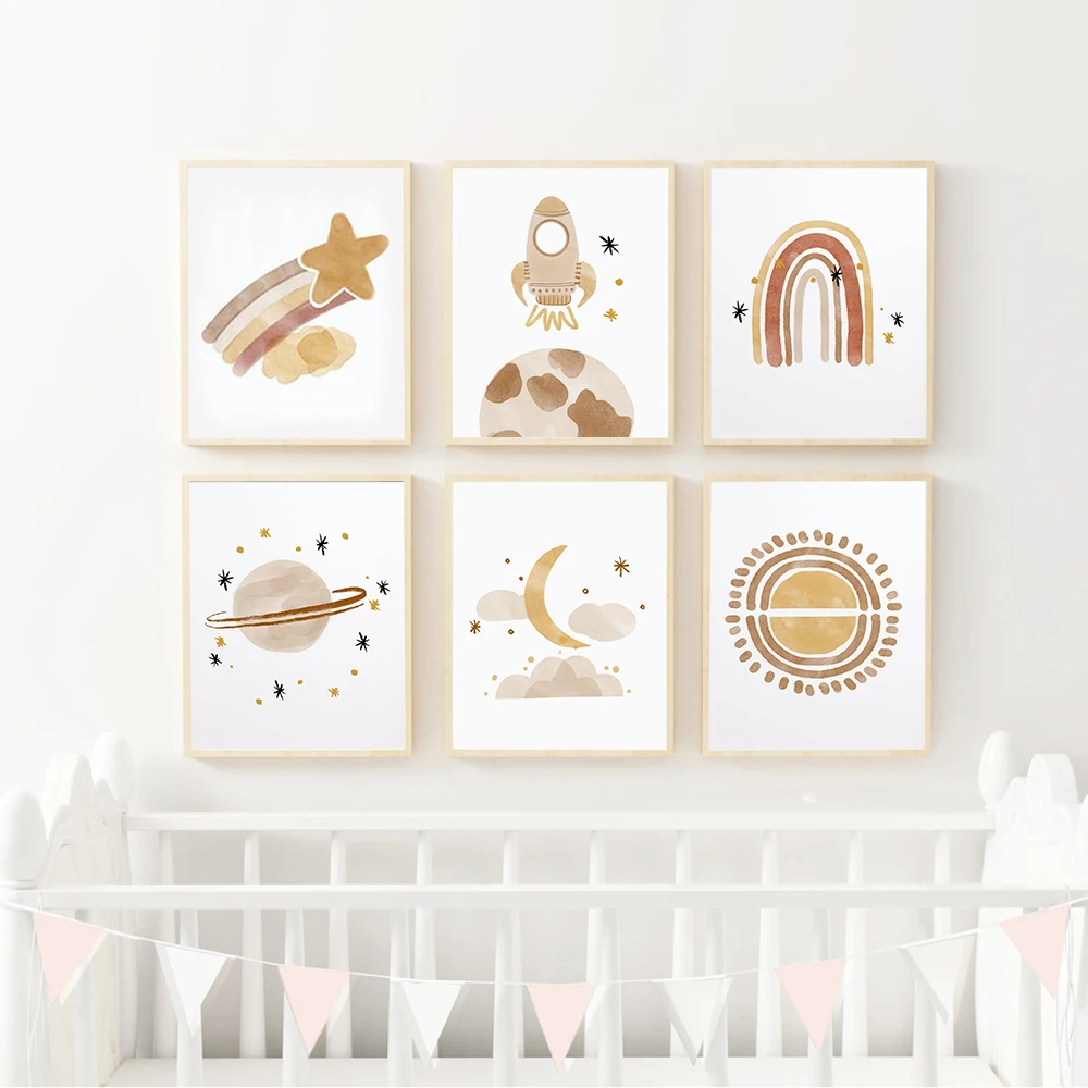 Детская Настенная картина, солнце, луна, звезда, радуга, искусство и принты, декор для детской комнаты, мультяшная Вселенная, картина для детской комнаты, плакат