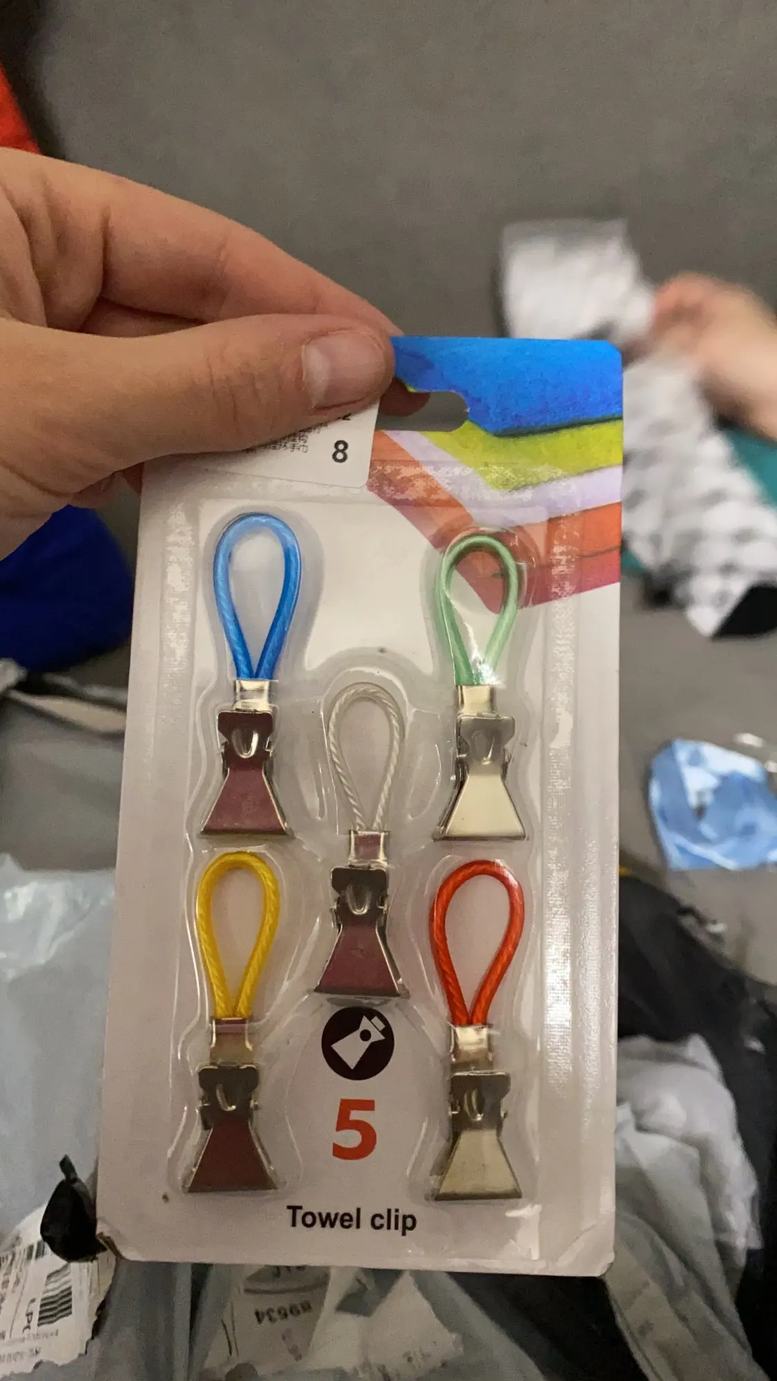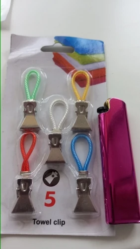 Упаковка из 5 водонепроницаемых разноцветных металлических зажимов для полотенец.