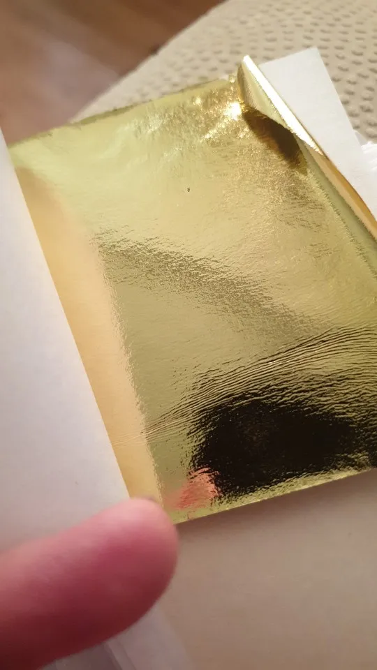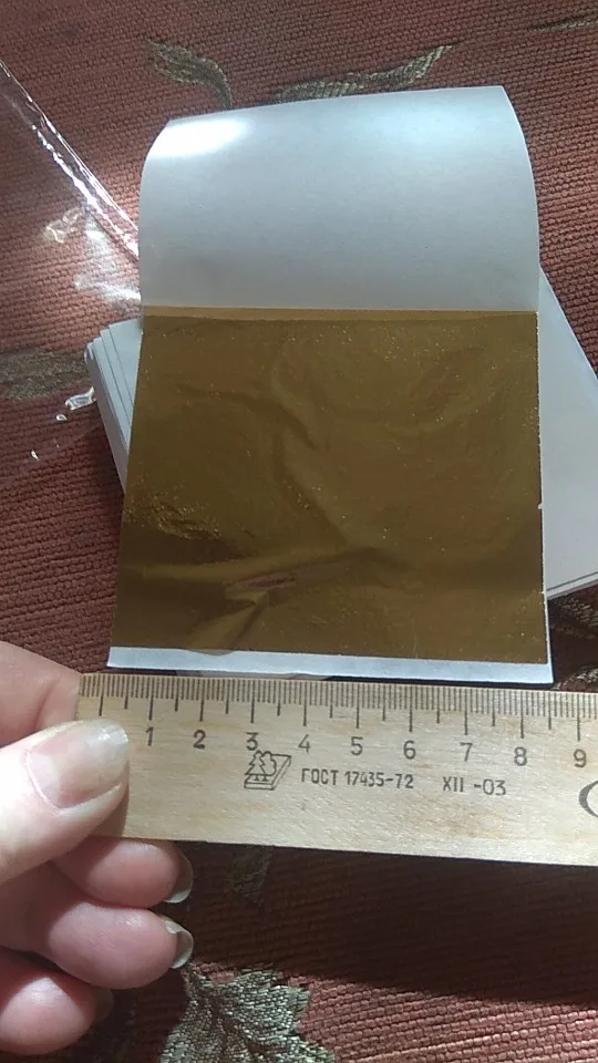 поталь хорошая, тонкая и это хорошо, так как не дает замятин и складок при нанесении, размер небольшой, но с учетом цены все ok) цвет нормальный, естественное золото, не ядовито желтое, выглядит прилично. каждый лист в отдельной кальке, а не книжкой, это удобно. рекомендую