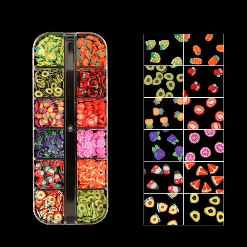 1 коробка для дизайна ногтей 3D фруктовые крошечные Ломтики DIY украшения 12 узоров Полимерная глина наклейки для ногтей хлопья аксессуары для маникюра
