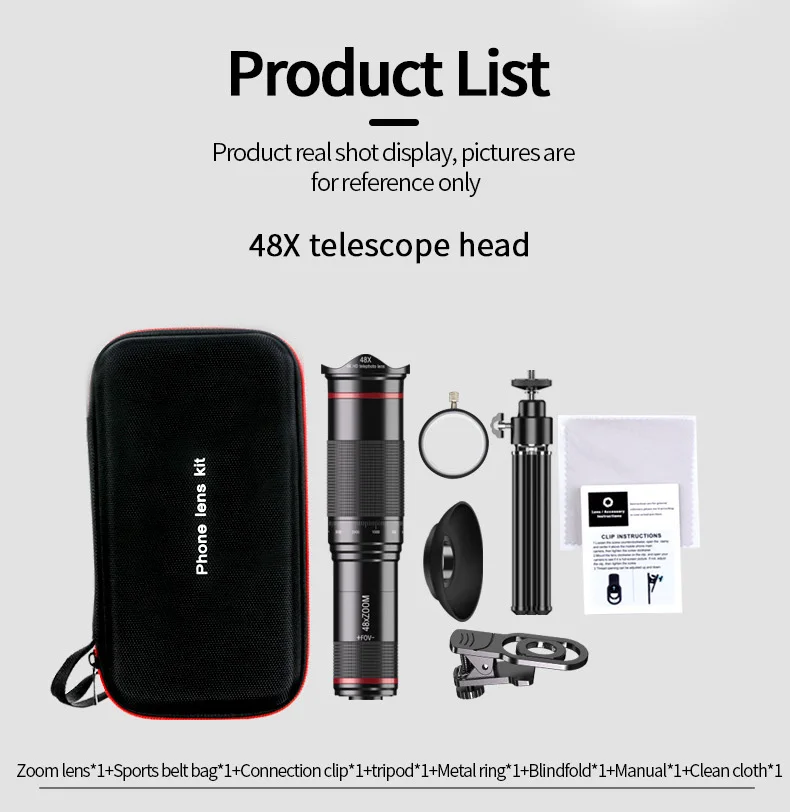 Особенности:1. Телескоп может использоваться как монокуляр.2. Подходит для большинства мобильных телефонов, включая флип-телефоны и бар-телефоны, телефон имеет заднюю камеру, может быть подключен к телескопу через зажим.3. Мобильный телефон может быть улучшен.4. Подходит для просмотра игр, концертов, туризма, наблюдения за животными, съемки на дальние расстояния и т. Д.5. Частный детектив фотографирует экспертизу, геологоразведку, управление лесным хозяйством, планирование железнодорожных портов и т. Д.Параметры:Название: 48X телеобъектив для камеры телефонаУвеличение продукта: 48xРазмер линз: 175*45 ммСпецификация резьбы: 40 мм спереди/17 мм в концеВес линзы: 0,18 кгПолный вес коробки конфигурация: 0,33 кгПолный вес коробки конфигурации: около 0,42 кг Примечание:1. Пожалуйста, используйте его осторожно, потому что объектив точно регулируется, если он падает или ударяется, поле зрения может не совпадать, и изображение будет отклоняться, nbsp2. Пожалуйста, не погружайтесь в воду. Если он попадет в воду, пожалуйста, восстановите его быстро.3. Пожалуйста, не смотрите на солнце абсолютно, ваши глаза могут иногда болеть и слепить.